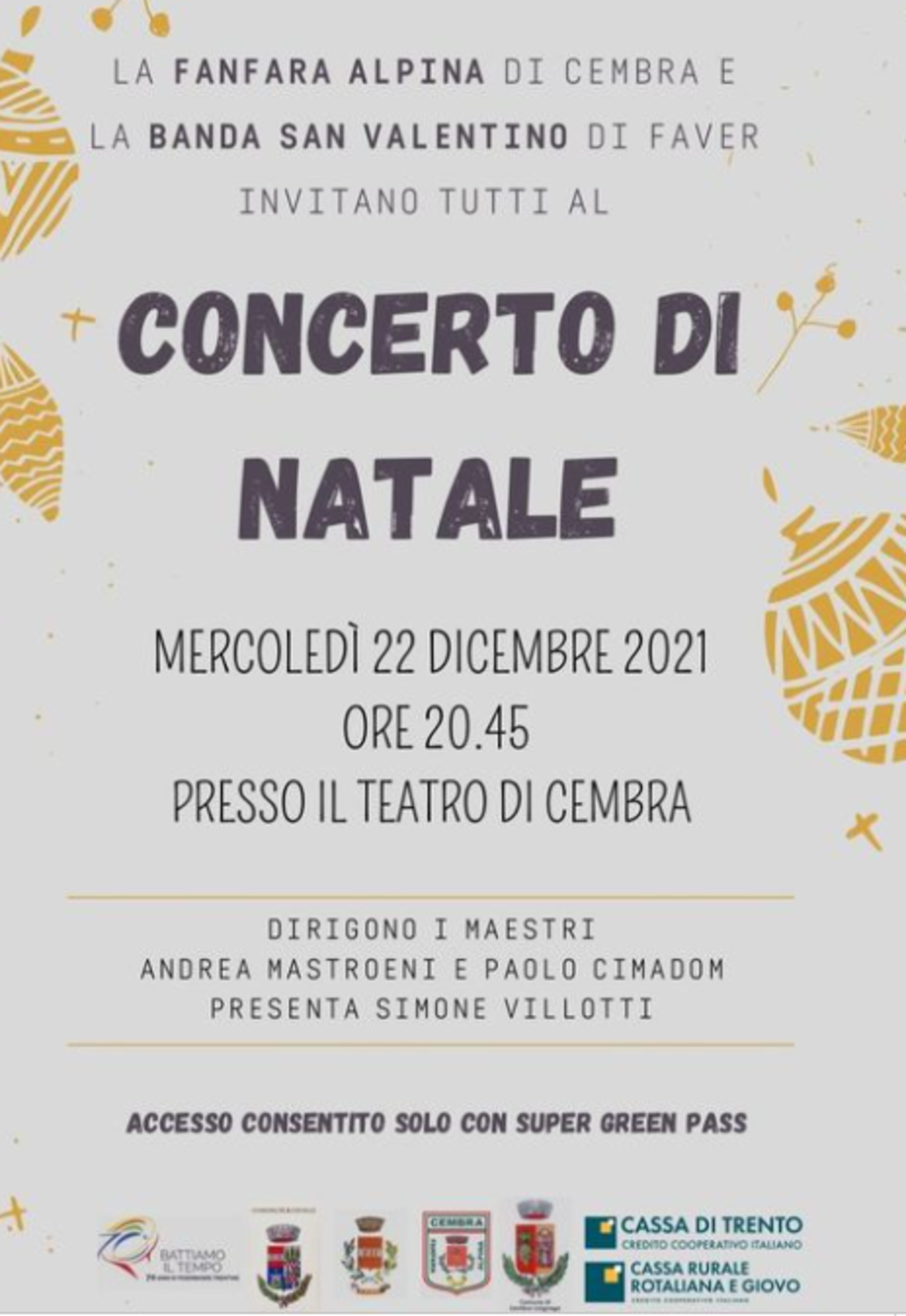 La Fanfara Alpina di Cembra e la Banda San Valentino di Faver, unite per questa unica occasione, sono liete di invitarvi al Gran Concerto di Natale mercoledì 22 dicembre 2021 alle ore 20.45 presso il nuovo Teatro di Cembra.Per l'occasione è stato pensato un programma tutto nuovo che passa dalle colonne sonore agli originali per banda, senza ovviamente dimenticare le marce da concerto.