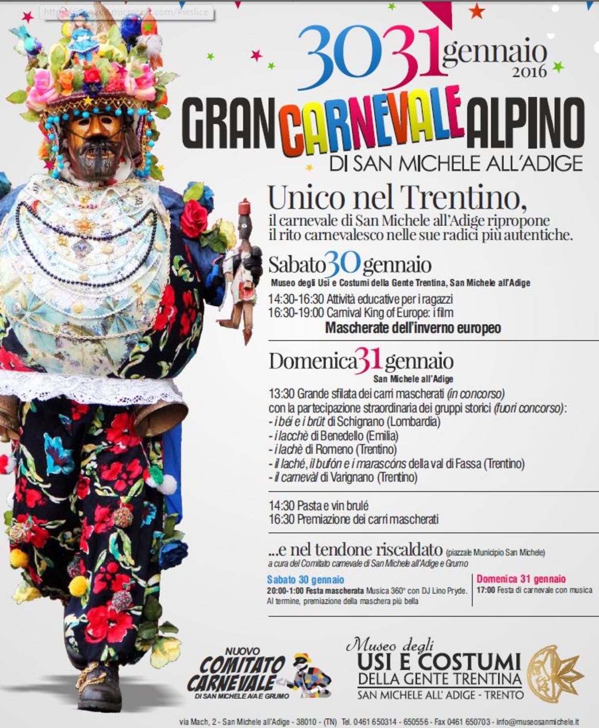 Unico nel Trentino, il carnevale di San Michele all’Adige ripropone il rito carnevalesco nelle sue radici più autentiche. Grazie alle ricerche del Museo degli Usi e Costumi della Gente Trentina, infatti, vengono invitati alla sfilata gruppi di antiche maschere di grande interesse etnologico dalle più remote valli dell’arco alpino. Così, insieme ai carri allegorici del circondario rotaliano, vedremo anche quest’anno le squadre dei figuranti dei carnevali più antichi, misteriosi e sconosciuti, in un unico contesto in cui curiosità antropologica e allegria carnevalesca si mescolano e si fondono.