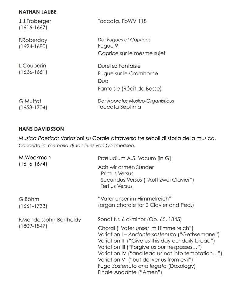 Nathan J. Laube ha rapidamente guadagnato un posto tra gli artisti d’élite nel mondo dell’organo. Il suo brillante e grazioso contegno hanno entusiasmato il pubblico e la critica negli Stati Uniti e in Europa. Laube ha ottenuto il diploma in organo presso la Musikhochschule di Stoccarda sotto la guida di Ludger Lohmann, il Prix de Spécialisé presso il Conservatoire à Rayonnement Régional di Tolosa, il Prix François Vidal presso Tolosa, il diploma presso il Curtis Institute of Music a Philadelphia sotto la guida di Alan Morrison e Susan Starr. Dopo il diploma ha ricevuto i riconoscimenti più importanti indetti dall’Institute: il Landis Award for Excellence in Academics e l’Aldwell Award for Excellence in Musical Studies. Si è esibito nei maggiori festival del mondo, tra cui Naumburg Orgelsommer, the 300th Anniversary festival of the 1714 Silbermann organ in the Freiberg Cathedral (Germany), the 2011 Lahti Organ Festival (Finland), the 2013 Orléans Organ Festival (France), the 2013 Lapua Festival (Finland), the 2013 Stuttgart Internationaler Orgelsommer (Germany), the 2014 Naumburg Orgelsommer (Germany). E’ Assistant Professor di organo all’ Eastman School of Music di Rochester, New York, e tiene masterclass in tutto il mondo.