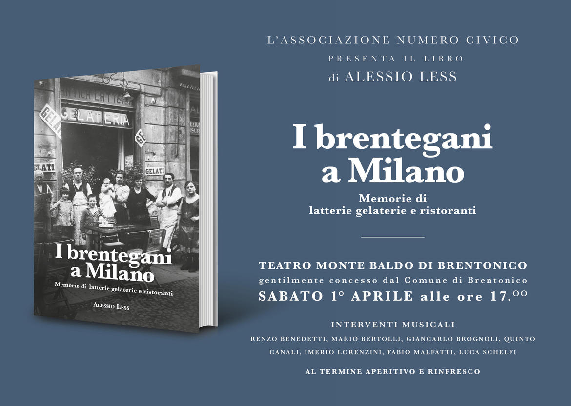 Al Teatro Monte Baldo di Brentonico sarà presentato il libro "I brentegani a Milano. Memorie di latterie gelaterie e ristoranti" (Alessio Less, La Grafica Mori, marzo 2023).