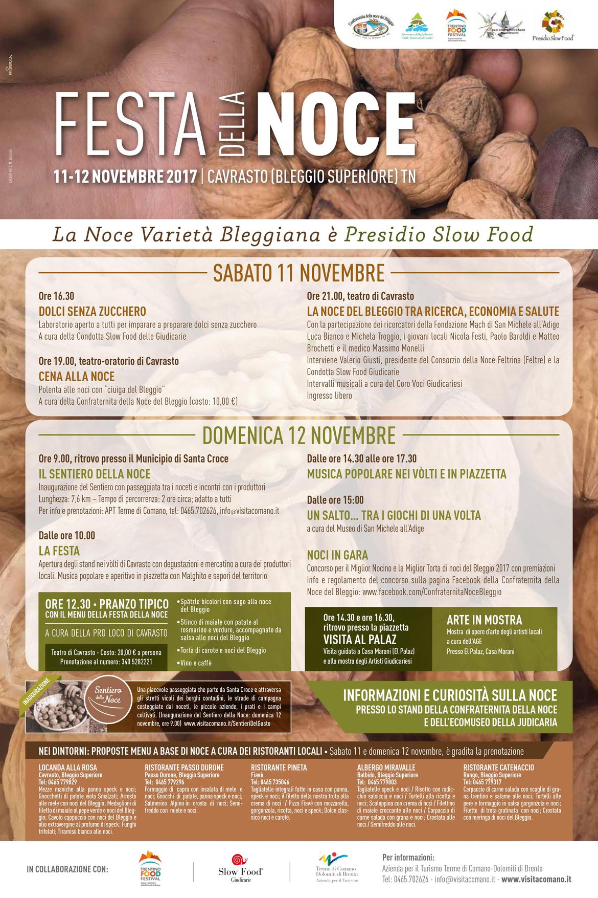 Per la Festa della noce il paese bleggiano si trasforma in una grande comunità enogastronomica, con le case, gli avvolti e le piazze che diventano piccole botteghe per la noce tipica della zona. Coltivata sul soleggiato altipiano fin dal 1550, questa varietà di noce si caratterizza per il gusto gradevole con una tipica nota speziata, il guscio sottile e facile da rompere, le dimensioni ridotte e l’insolita forma allungata. La raccolta comincia nella seconda metà di settembre e si esegue ancora a mano. Le noci si acquistano direttamente dai contadini, che da sempre ne valorizzano il gusto trasformandole in profumate torte, pagnotte fragranti, robusto liquore nocino e il raro salame alle noci.