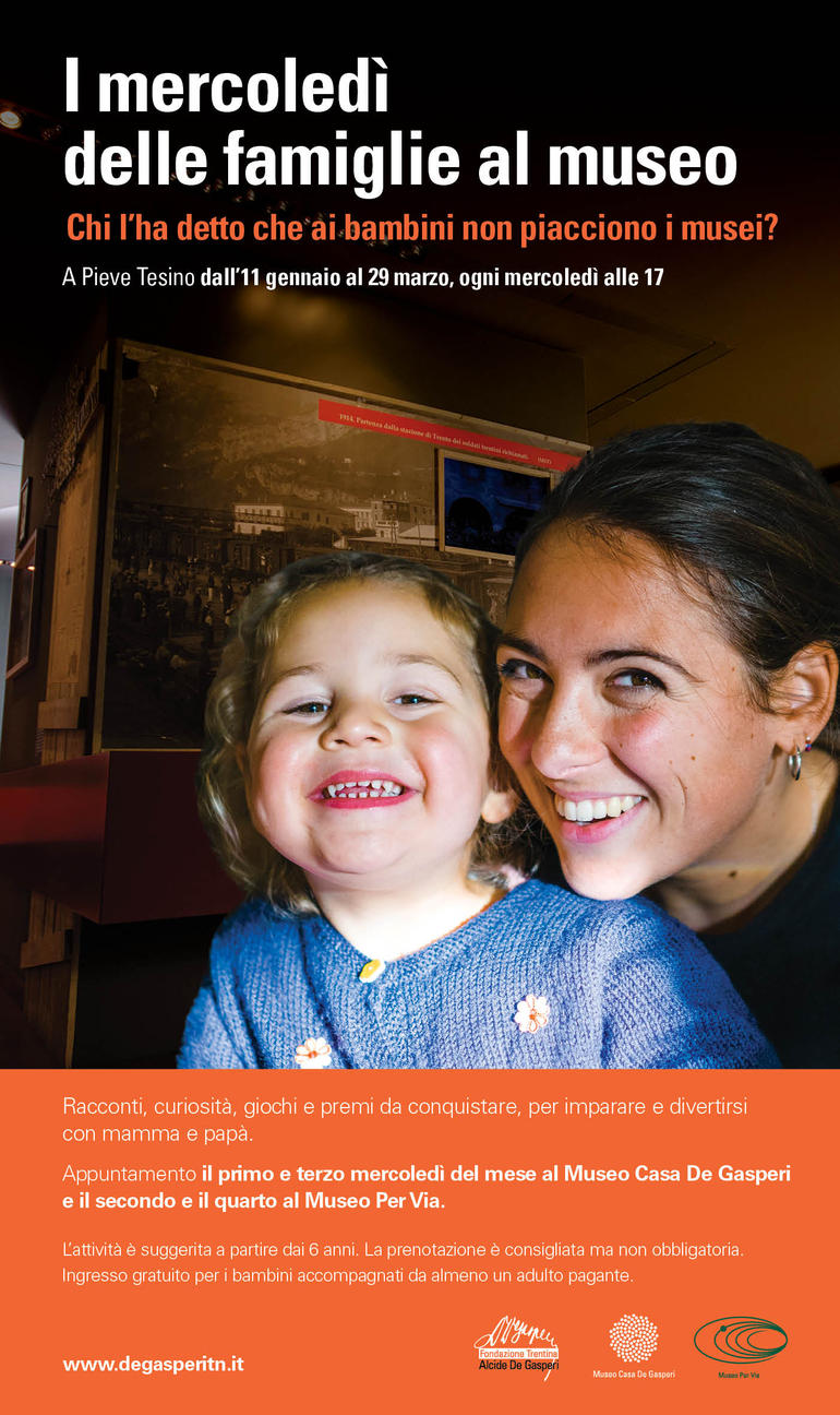 La rassegna “I mercoledì delle famiglie al museo” prende il via l’11 gennaio al Museo Per Via e si conclude il 29 marzo al Museo Casa De Gasperi. L’appuntamento è per ogni mercoledì dalle 17 alle 19 e le attività si terranno il primo e terzo mercoledì del mese al Museo Casa De Gasperi e il secondo e il quarto al Museo Per Via.