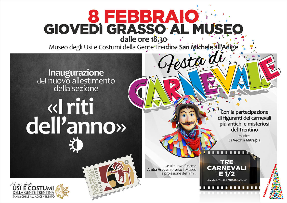 E al nuovo cinema Amba Aradam presso il Museo la proiezione del film “Tre carnevali e ½” di Michele Trentini, MUCGT, 2007, 50’. Durante la serata saranno offerti pasta, crostoli e vino. La festa sarà animata dalla musica popolare de “La Vecchia Mitraglia”.