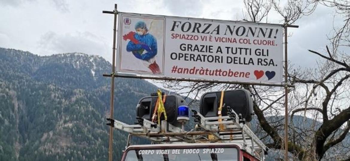Molti i segni di solidarietà verso chi opera nelle case di riposo giudicariesi da parte della popolazione e da parte delle amministrazioni. Due giorni fa uno striscione era stato posto di fronte alla Casa di Riposo di Spiazzo per manifestare a tutti gli anziani e agli operatori la vicinanza del paese. Oggi il vicesindaco, Angelo Capelli, ha voluto ribadire la vicinanza con un messaggio "lanciato" con il megafono.