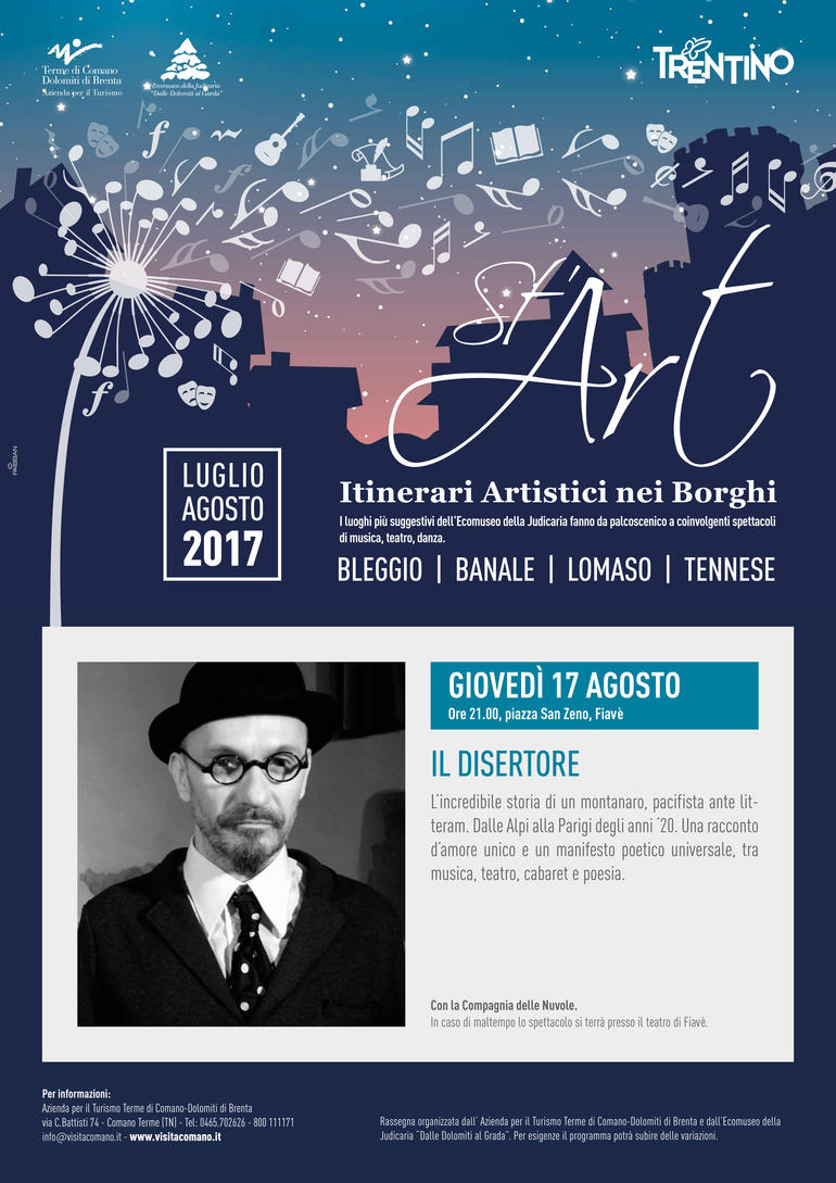 Itinerari Artistici nei Borghi continua il suo viaggio nei luoghi più suggestivi dell’Ecomuseo della Judicaria e arriva a Fiavè, nella suggestiva piazza di San Zeno, con lo spettacolo “Il Disertore”. Ispirato ad una storia vera, IL DISERTORE narra con parole e musica, l'incredibile epopea di Virginio Ferri, un montanaro trentino. Grazie ai suoi appunti, agli esilaranti diari e alle sue lettere d'amore (miracolosamente ritrovate di recente a Parigi, e in realtà mai spedite alla sua amata) scopriamo un essere straordinario e il suo lungo viaggio attraverso la prima parte del '900. Lo ritroviamo prima soldato inviato sul fronte orientale, immerso nell'incubo della grande guerra. Poi, ricercato come disertore, rocambolescamente in fuga attraverso l' Europa. Infine originalissimo artista in Svizzera e a Parigi (dove si perderanno le sue tracce), a contatto con i più grandi e straordinari artisti delle avanguardie storiche del '900. Ma “Il Disertore” non è solo questo: è anche un manifesto poetico e un po' la storia Europea. E' una discesa nell'anima, un ossessione d'amore; è canzone e musica. E' la vicenda commovente e comica di un montanaro poeta, di un pacifista ante litteram, della sua vita consumata dal fuoco dell'arte e dell'amore.