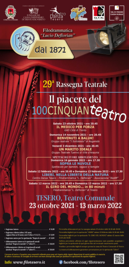 Nell’ora precedente all’inizio di ogni rappresentazione sarà possibile acquistare i biglietti per lo spettacolo di quel giorno fino ad eventuale esaurimento posti.Vendita e prevendita biglietti sempre presso la cassa del Teatro Comunale di Tesero