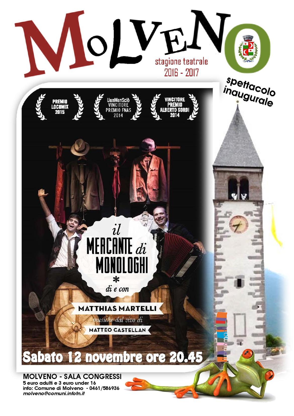 Matthias Martelli si presenta al pubblico come un vero e proprio giullare contemporaneo: un mercante, che, accompagnato dal suo antico carretto di legno rigonfio di vestiti e con la complicità delle note del maestro Castellan, mette in vendita una merce speciale, surreale quanto necessaria: monologhi! E così giacche e cappelli, una volta indossati, diventano protagonisti della scena dando vita a una delirante galleria di “mostri contemporanei”: dal politico al professore di antropologia, dal cantante Rods all’esilarante Don Iphon, predicatore delle nuove tecnologie, fino al delirio finale in cui il mercante si trasformerà in pochi minuti in una moltitudine di personaggi. «Il mercante di monologhi» vuole riportare in auge un teatro vivo, vitale, che parli di noi, capace di far saltare lo spettatore sulla sedia, che faccia ridere senza vergognarsi, che provochi senza nascondersi, un teatro che torni a far bruciare di vita le radici popolari del nostro teatro, per arrivare infine alla liberazione dell’attore e del suo pubblico in un’unica, grande, esplosione di risate e di follia.