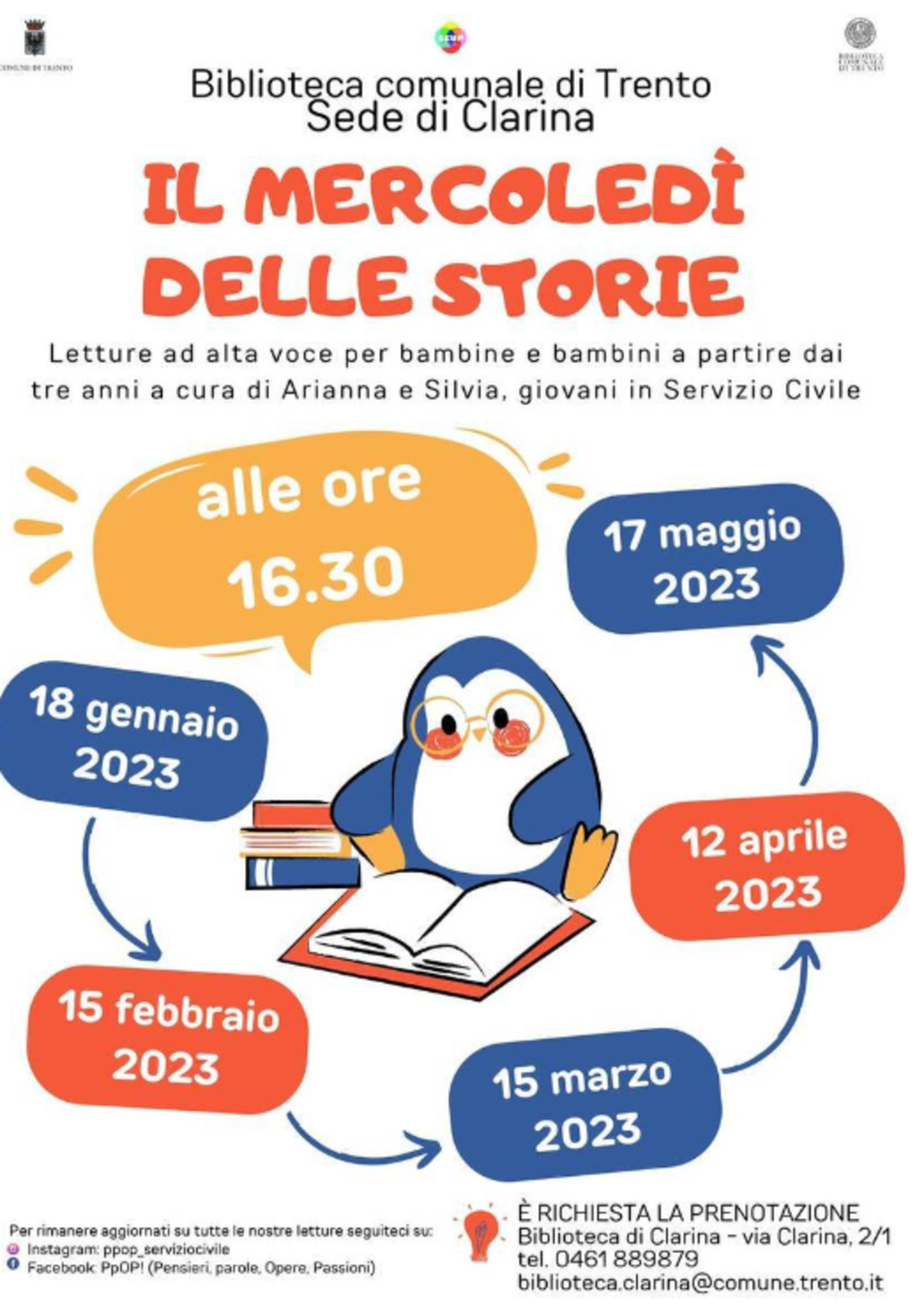 L'ingresso è libero con prenotazione obbligatoria al numero 0461 889879 o via mail all'indirizzo mail biblioteca.clarina@comune.trento.it