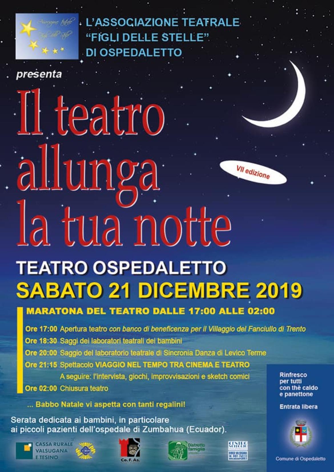 Il Teatro Allunga la tua Notte è una manifestazione teatrale che ormai quest'anno è giunta alla VII edizione. Le porte del teatro di Ospedaletto si apriranno alle ore 17.00 e si chiuderanno alle 02.00 circa del 21 dicembre 2019.