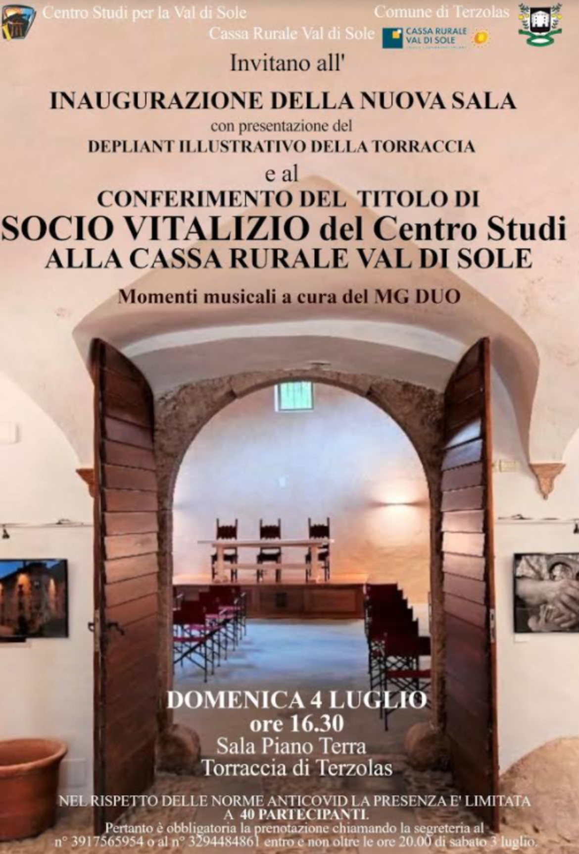 Dopo una lunga parentesi in cui l’ampio spazio al piano terra dello splendido palazzotto rinascimentale “La Torraccia” di Terzolas (oggi sede Municipale e della Biblioteca del Centro Studi) è stato adibito a fini diversi, ora torna ad uno scopo più nobile: Sala incontri, ottima per convegni, concerti, momenti di rappresentanza e quant’altro. Sarà inaugurata domenica 4 luglio a partire dalle ore 16.30.