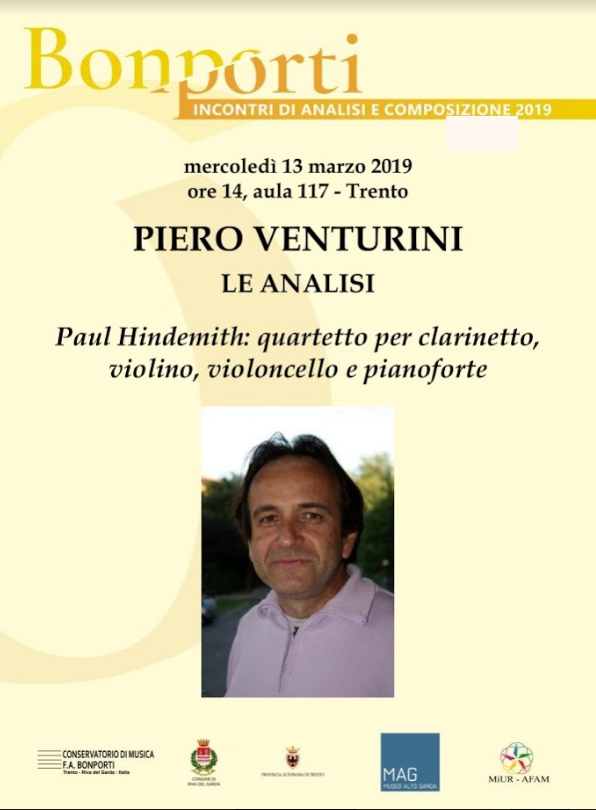 PIERO VENTURINI ha compiuto gli studi di pianoforte, musica corale e composizione presso il Conservatorio di Bologna. E’ relatore di seminari e congressi in varie città italiane su tematiche relative all’analisi musicale rivolta agli interpreti. Ha partecipato al Convegno nazionale di analisi musicale di Acri (Cs) nel 2003 e di Rimini nel 2006, 2008, 2010 e 2014. Ha pubblicato articoli e saggi per l’editore Armelin, per la rivista online “Analitica” e per la Rivista di Analisi e Teoria Musicale (RATM). Alcune sue ricerche sono pubblicate nel sito web Academia.