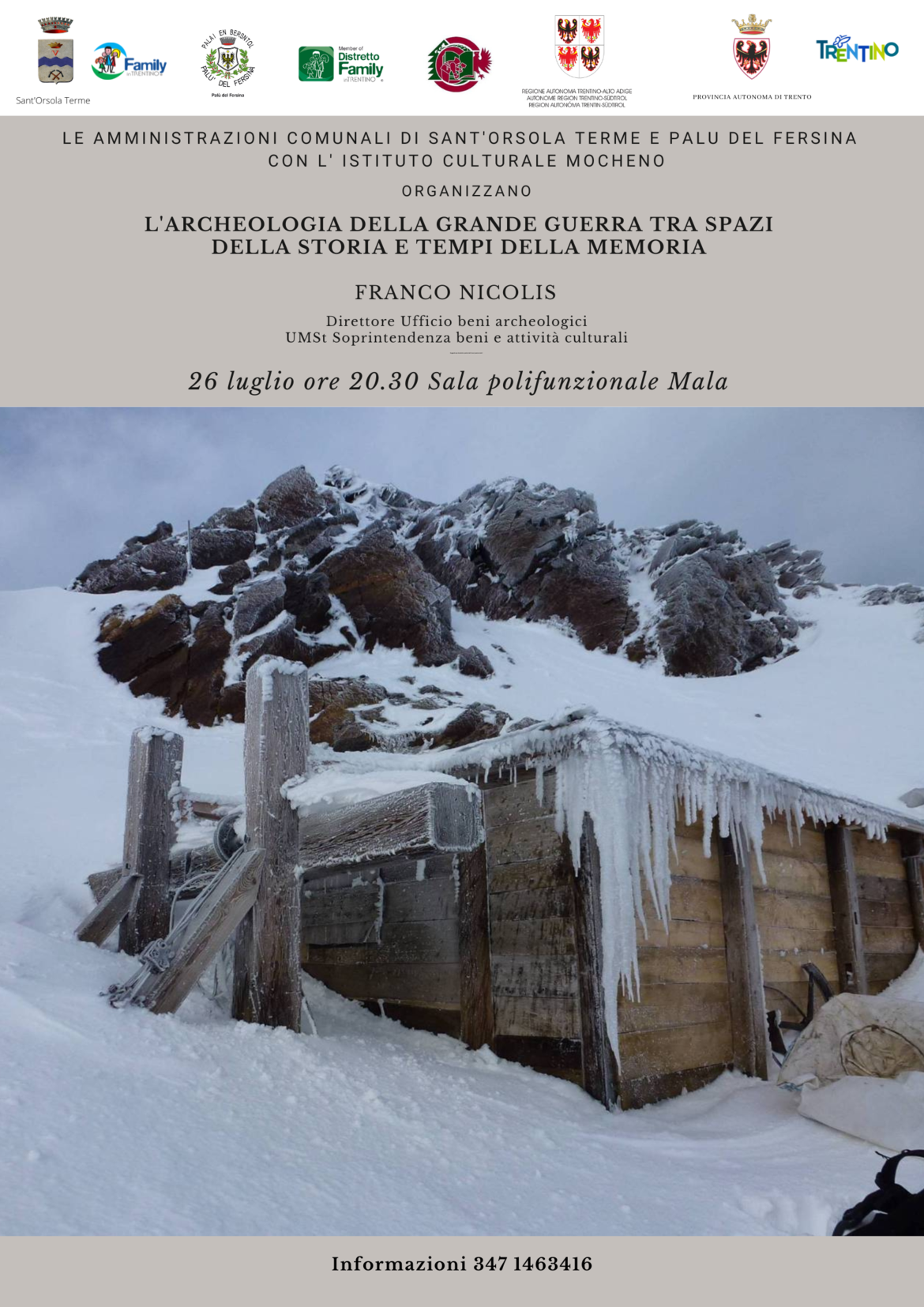 Franco Nicolis, direttore dell'Ufficio beni archeologici, ci parlerà degli interventi di recupero di resti di soldati effettuati sul ghiacciaio del Presena e alle pendici occidentali del Corno di Cavento nel Gruppo dell'Adamello oltre che degli scavi archeologici condotti nel sito di Punta Linke. Strutture, materiali e corpi rimasti sepolti per cento anni sotto una coltre di ghiaccio sul più alto fronte della Grande Guerra, a oltre 3000 metri di altitudine che affiorano a seguito dei cambiamenti climatici degli ultimi anni. La serata è organizzata dalle amministrazioni comunali di Sant'Orsola Terme e Palù del Fersina in collaborazione con l'Istituto Mòcheno grazie al sostegno della Regione Autonoma Trentino Alto Adige.