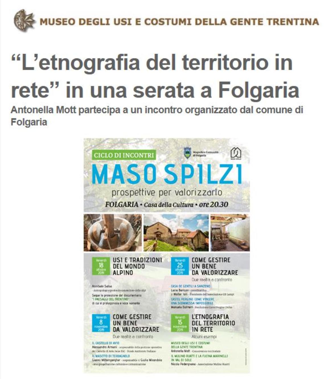 Per la realizzazione di questo progetto sono state organizzate delle serate per un confronto pubblico invitando alcune realtà, tra cui il Museo degli Usi e Costumi della Gente Trentina, che possano portare la propria esperienza nel settore.