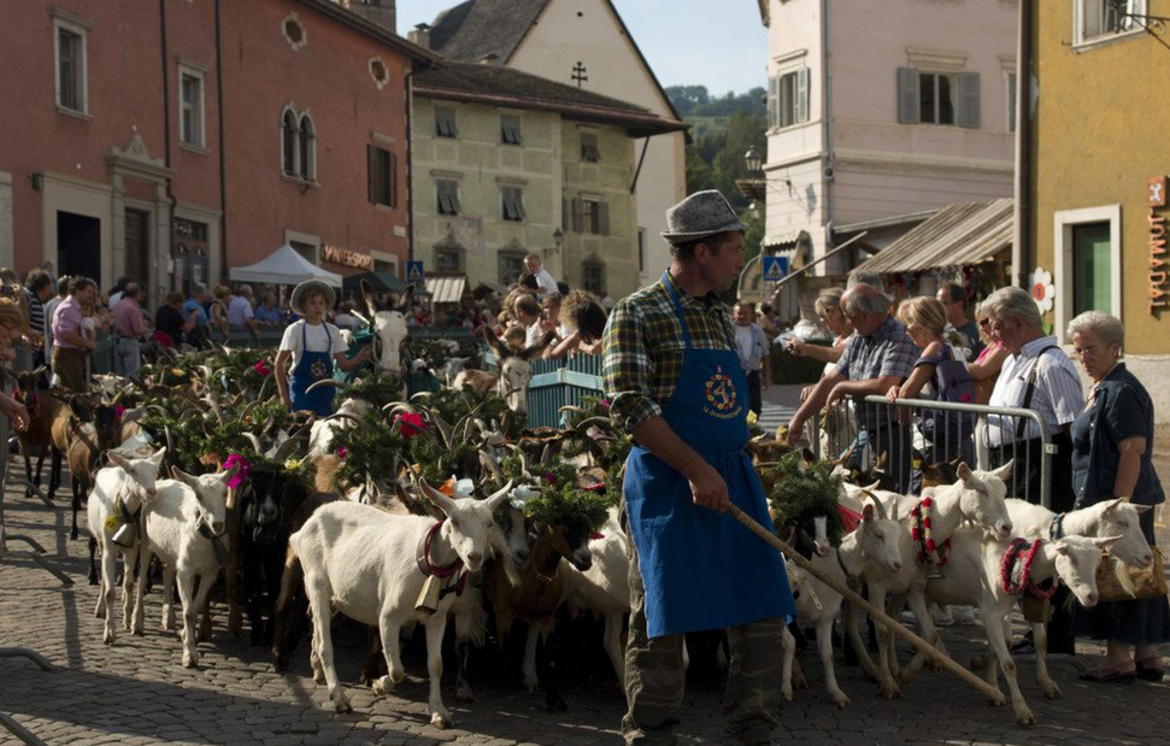 Suggestiva festa per il rientro a Cavalese delle capre dall’alpeggio estivo ornate con corone di fiori. Il gregge sfila in mezzo alle case accompagnato dai pastori in una splendida festa ricca di colore e tradizione.