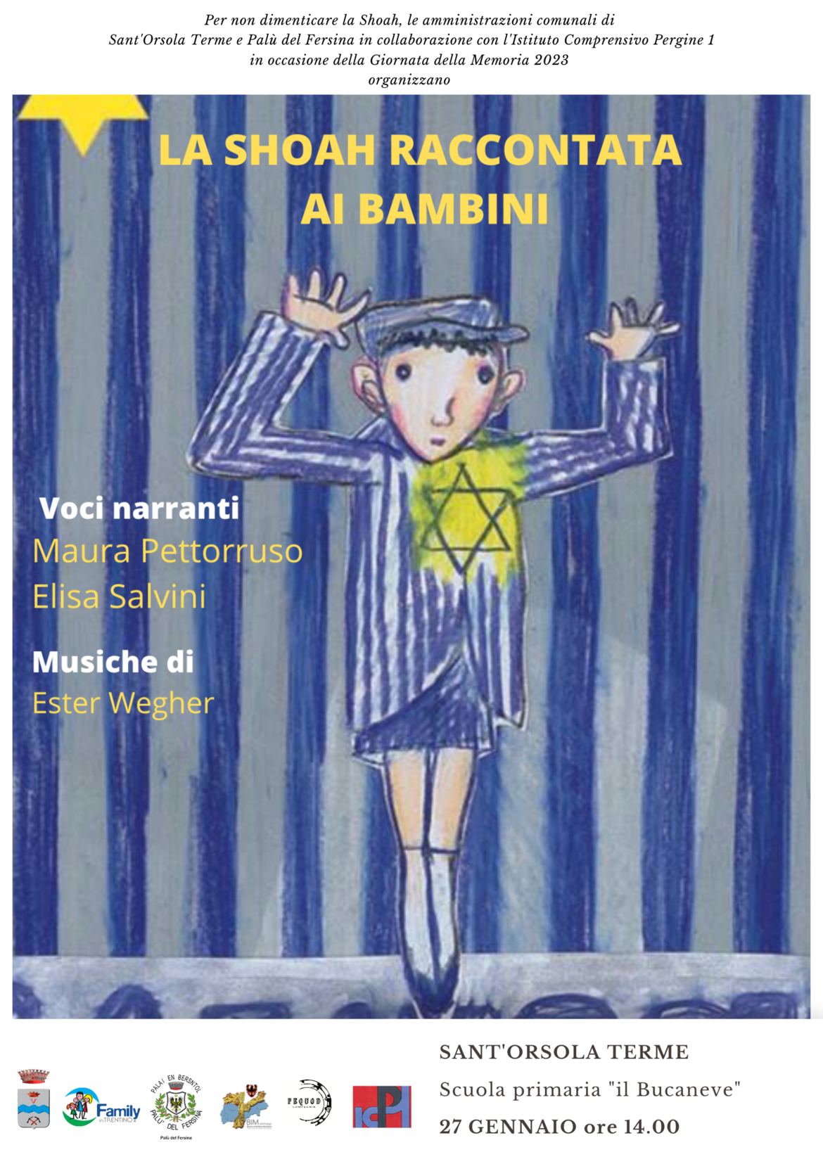 Le amministrazioni comunali di Sant'Orsola Terme e Palù del Fersina, in collaborazione con l'Istituto Comprensivo Pergine 1, propongono alle scuole primarie di Sant'Orsola Terme e Fierozzo per la Giornata della Memoria 2023 “LA SHOAH RACCONTATA AI BAMBINI”, reading tratto da “Come ali di gabbiano” e "L'albero di Anna" con musica dal vivo e proiezioni. Con Maura Pettorruso e Elisa Salvini. Musiche dal vivo di Ester Wegher (viola e loop station).