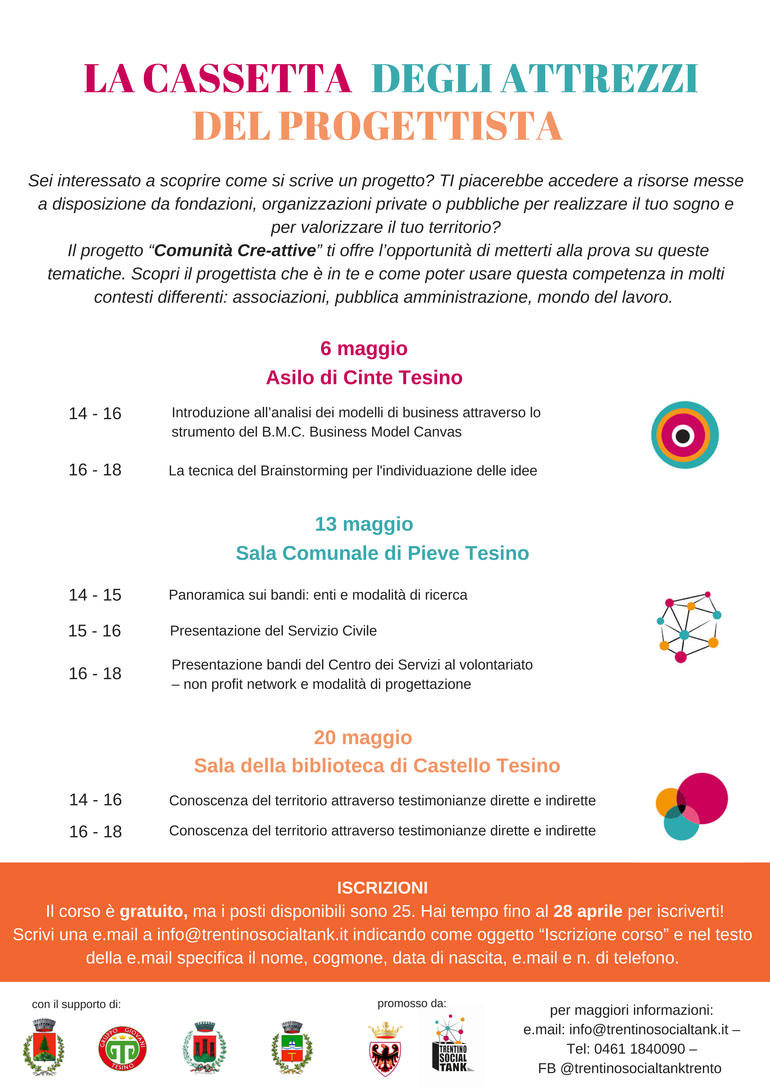 Il corso si svolgerà il 6 maggio presso l’asilo di Cinte Tesino, il 13 maggio presso la sala Polifunzionale di Pieve Tesino e il 20 maggio presso la sala della biblioteca di Castello Tesino. In questi tre pomeriggi di quattro ore ciascuno, verranno affrontati svariati temi come il reperimento dei fondi attraverso i bandi, l’opportunità del Servizio Civile, la mappatura del territorio, il Centro dei Servizi per il Volontariato e gli strumenti utili per l’individuazione e la stesura dell’idea progettuale.