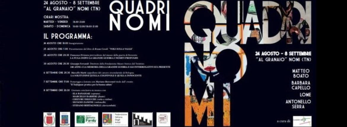 In occasione della mostra “Quadri Nomi” promossa da Claudio Mattè “Al Granaio” di Nomi, sono in programma appuntamenti musicali, conferenze e dibattiti. Martedì 27 agosto è previsto un incontro dal titolo