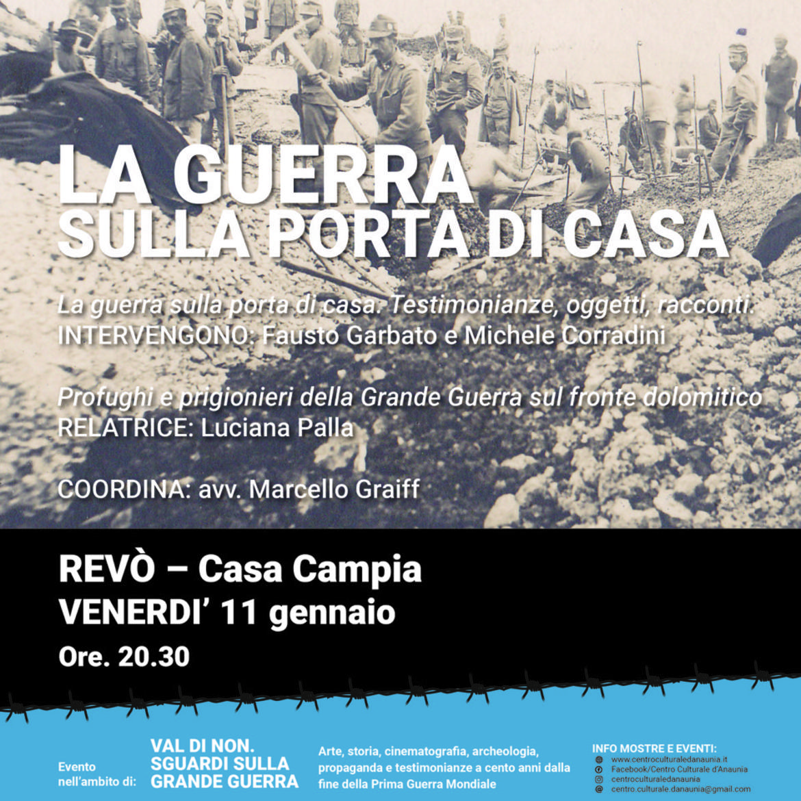 Nell'ambito della mostra "Val di Non. Sguardi sulla Grande Guerra" incontro dal titolo "La guerra sulla porta di casa. Testimonianze, oggetti, racconti" intervengono, Fausto Garbato e Michele Corradini e "Profughi e prigionieri della Grande.Guerra sul fronte dolomitico" con la relatrice Luciana Palla e coordina l'avv. Marcello Graiff.
