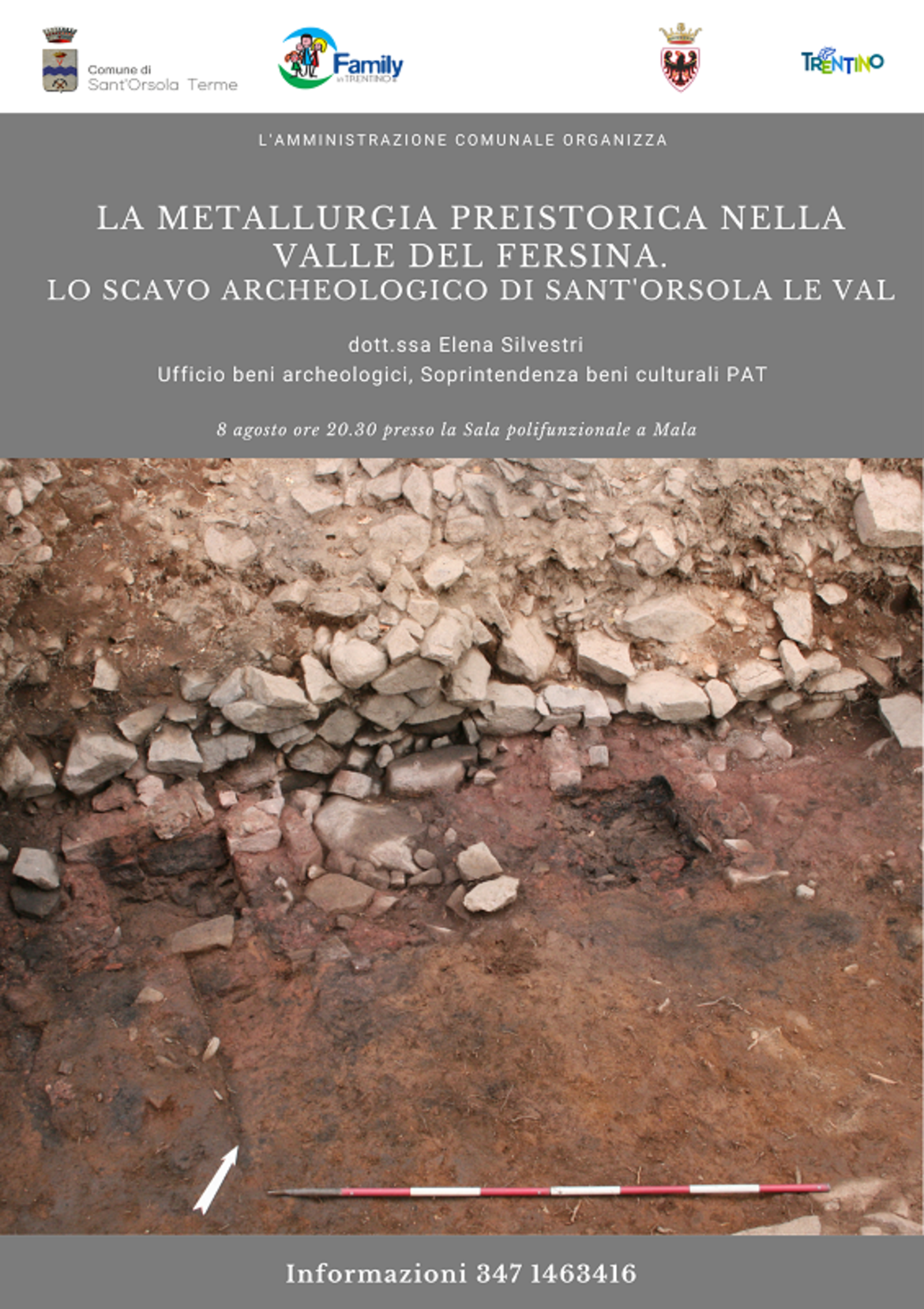 L'amministrazione comunale di Sant'Orsola Terme organizza “La metallurgia preistorica nella Valle del Fersina. Lo scavo archeologico di Sant’Orsola Le Val" a cura della dott.ssa Elena Silvestri dell'Ufficio beni archeologici della Soprintendenza beni culturali della Pat.