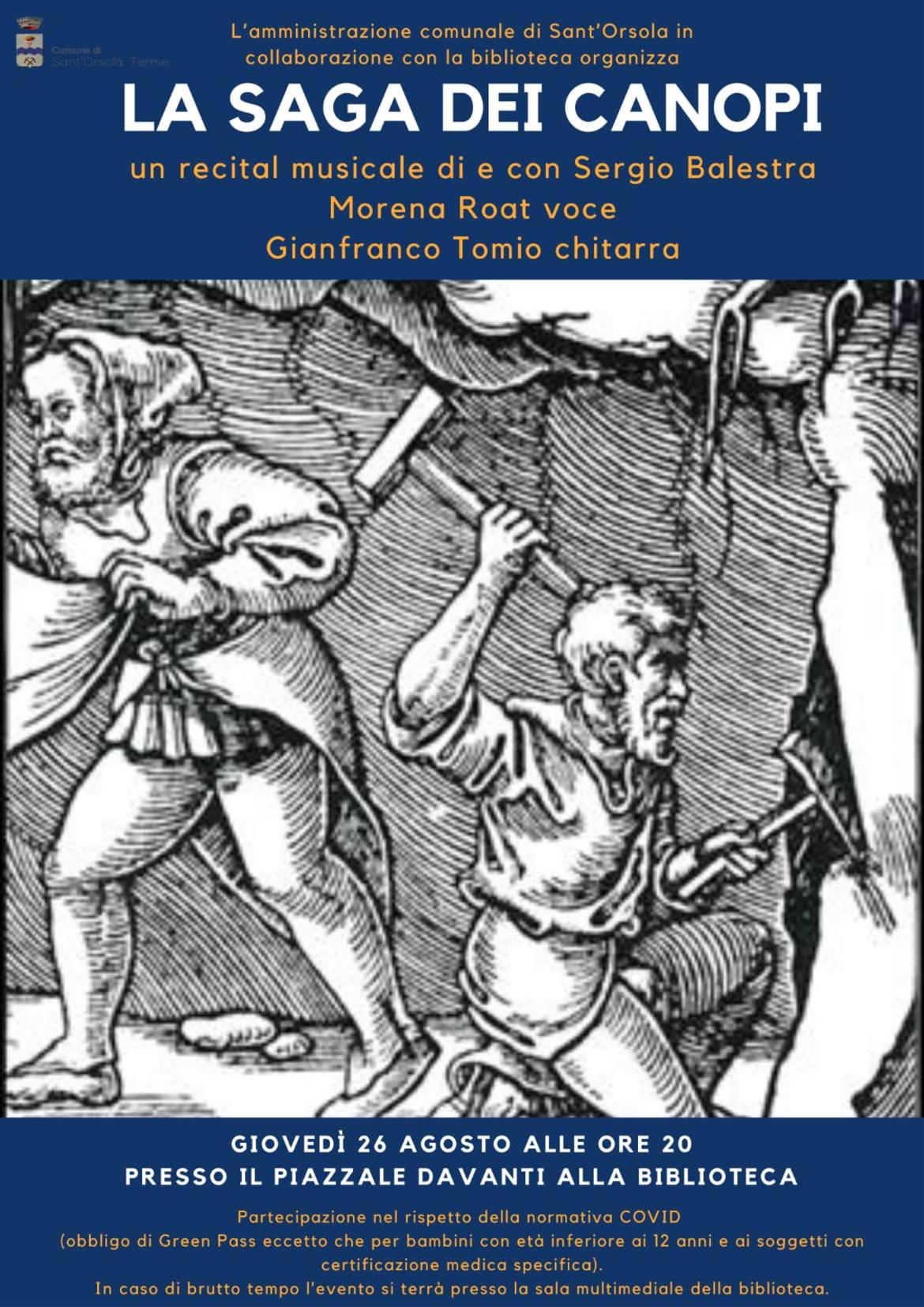 L'amministrazione comunale di Sant’Orsola in collaborazione con la biblioteca organizza giovedì 26 agosto alle ore 20 presso il piazzale davanti alla biblioteca “La saga dei Canopi” un recital musicale di e con Sergio Balestra.