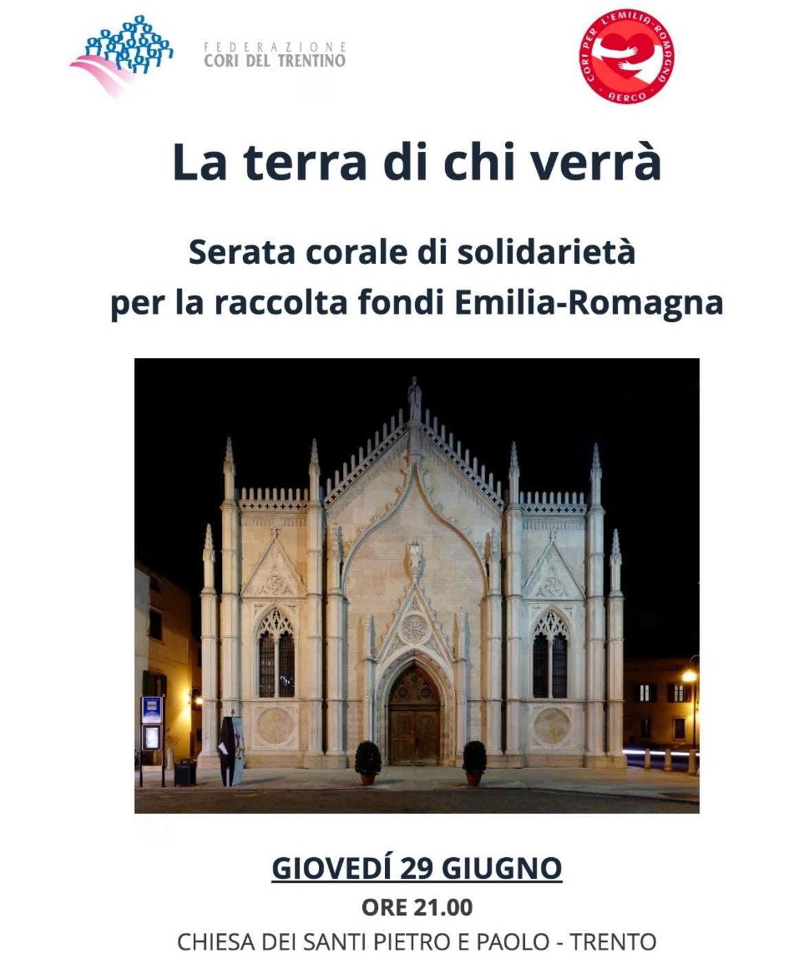 S'intitola “La terra di chi verrà - serata corale di solidarietà per raccolta fondi Emilia Romagna”, il concerto in programma giovedì 29 giugno alle 21.00 nella chiesa parrocchiale dei Santi Pietro e Paolo a Trento (Piazzetta Anfiteatro).