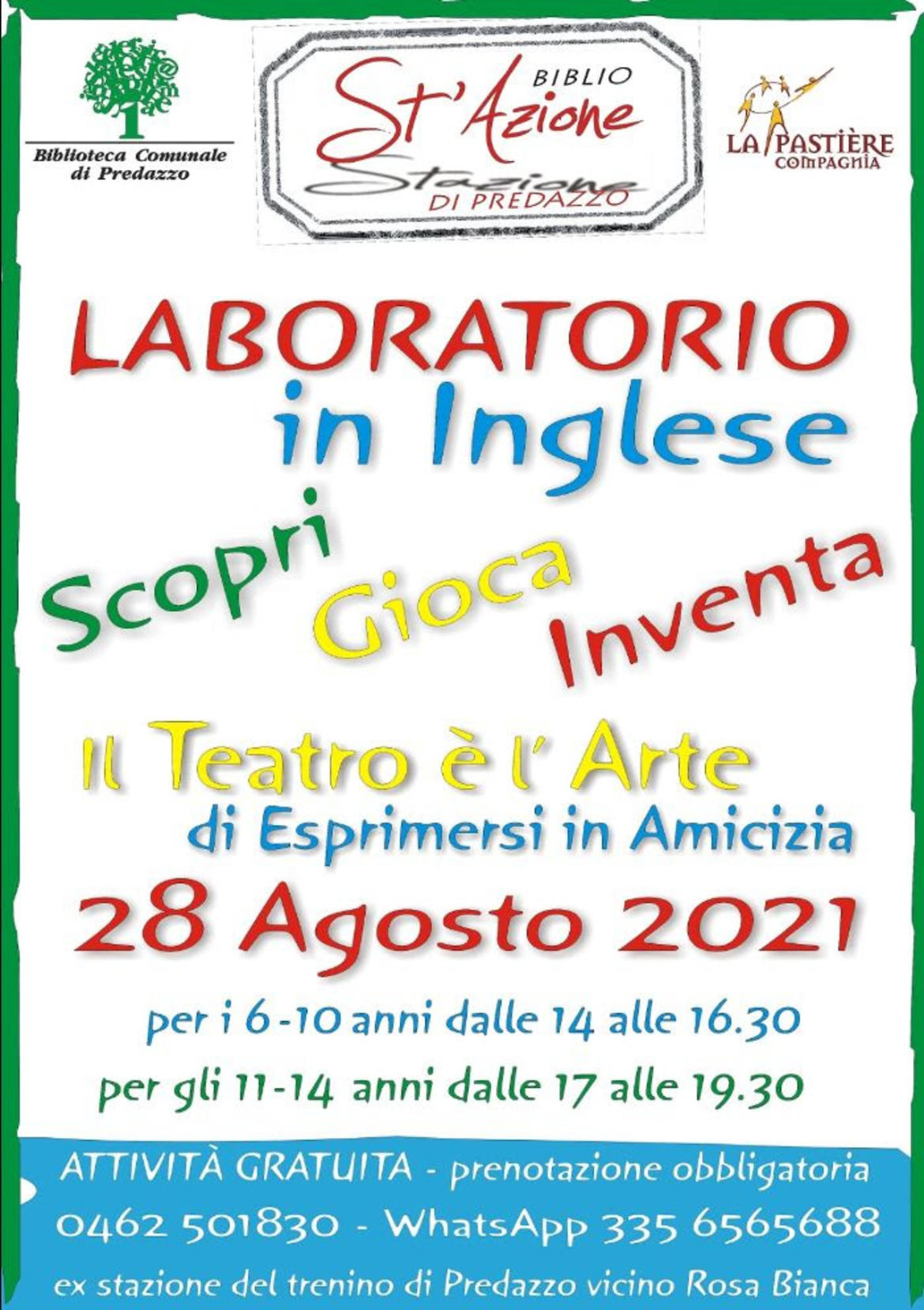 Sabato 28 agosto presso la Vecchia stazione del treno due laboratori artistici/teatrali in lingua inglese con due formAttrici della “Compagnia La Pastière”. Dalle 14 alle 16.30 per la fascia d'età dai 6 ai 10 anni. Dalle 17 alle 19.30 dagli 11 ai 14 anni. Un modo divertente e originale per abituarsi a parlare in una lingua straniera. Non è richiesta la conoscenza della lingua.