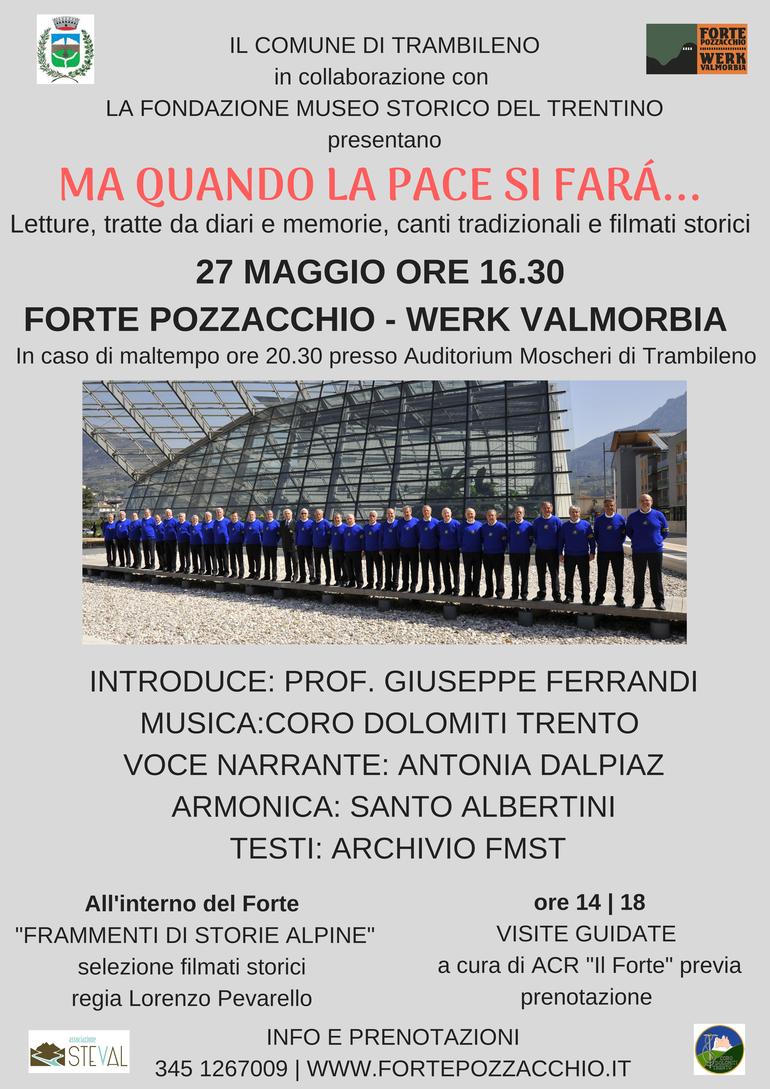 - Ore 16.30 | “Ma quando la pace si farà” Letture tratte da memorie e diari, canti tradizionali e filmati storici. Introduzione a cura del Prof. Giuseppe Ferrandi accompagnato dal Coro Dolomiti Trento, dalla voce narrante di Antonia Dalpiaz e dall’armonica di Sandro Albertini nel Fossato di gola. In collaborazione con la Fondazione Museo Storico del Trentino.