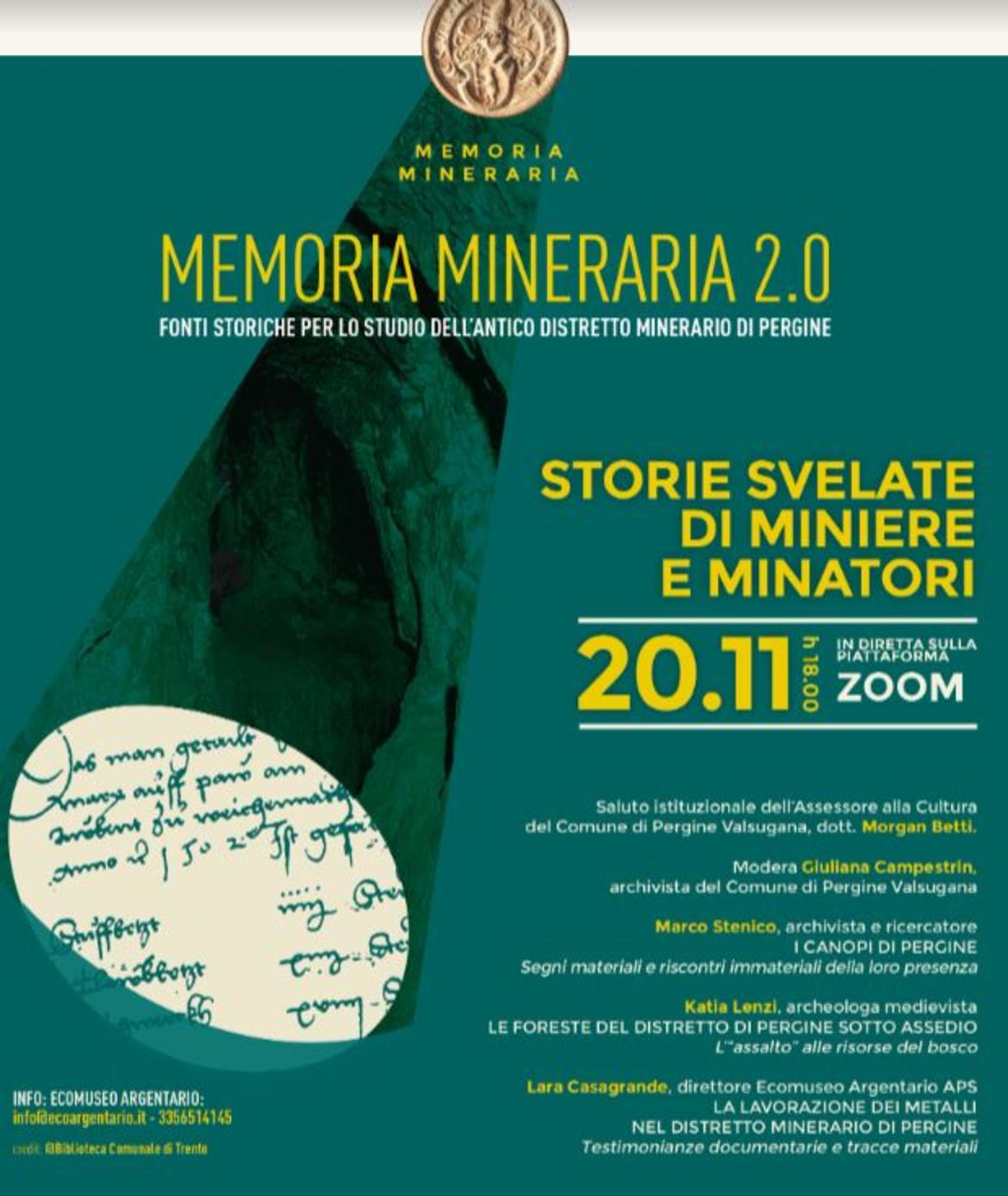 L’iniziativa è organizzata nell’ambito del progetto “Memoria mineraria 2.0. Fonti storiche per lo studio dell' antico Distretto minerario di Pergine”, che vede la partecipazione di partner importanti come la Comunità Alta Valsugana e Bersntol, il Dipartimento di Lettere e Filosofia dell’Università di Trento, l’Istituto culturale mòcheno/Bersntoler Kulturinstitut, la
