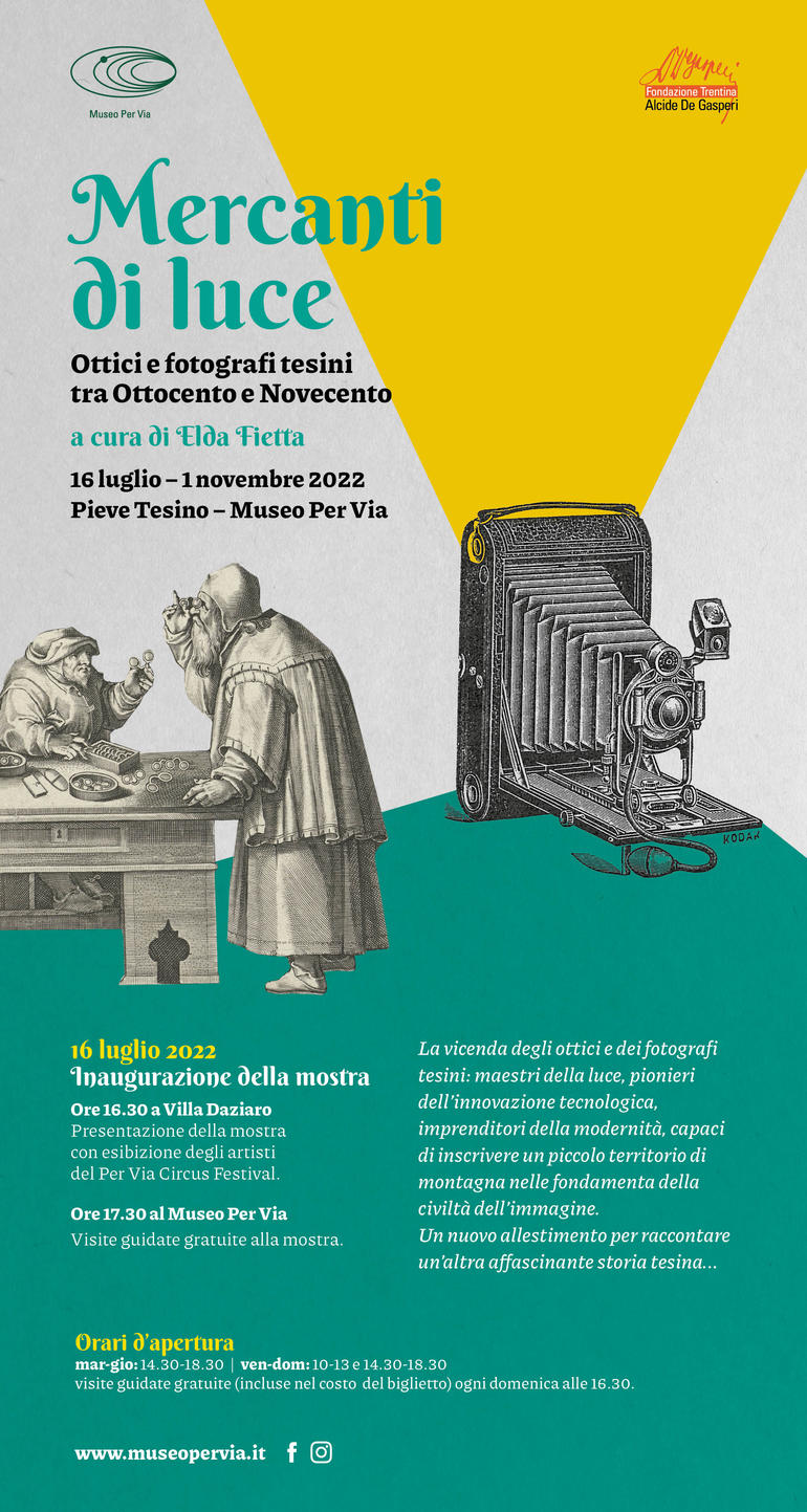 Ma se le vicende degli “uomini delle immagini” sono già state più volte celebrate e sono oggetto dell’allestimento permanente del Museo Per Via di Pieve Tesino, quelle non meno eccezionali degli ottici e dei fotografi tesini attivi tra Otto e Novecento erano rimaste finora quasi sconosciute. Una vera e propria storia nella storia, riportata alla luce dai recenti studi di Elda Fietta, esperta della storia del Tesino, e raccontata nella mostra intitolata “Mercanti di luce. Ottici e fotografi tesini tra Ottocento e Novecento” che il Museo Per Via si appresta ad inaugurare il prossimo sabato 16 luglio alle 16.30. Una presentazione artistica che si terrà negli spazi della storica Villa Daziaro a Pieve Tesino, in cui le spiegazioni della curatrice si alterneranno alle esibizioni degli artisti circensi del Per Via Circus Festival, la manifestazione che animerà il Tesino per tutta la settimana. Subito dopo la presentazione sarà possibile raggiungere il Museo Per Via, situato a pochi minuti a piedi dalla Villa, e visitare gratuitamente l’esposizione. Attraverso una ricchissima selezione di oltre 100 documenti e fotografie e grazie al fascino di antichi apparecchi fotografici, di strumenti per misurazione della vista, di barometri e di stravaganti apparecchiature d’epoca, la mostra ci accompagnerà dunque sulle rotte dei primi venditori di stampe tesini che, fiutando l’occasione di nuovi affari, iniziarono a dedicarsi al commercio di occhiali: un prodotto antico che in età moderna conosce grande fortuna e diffusione.