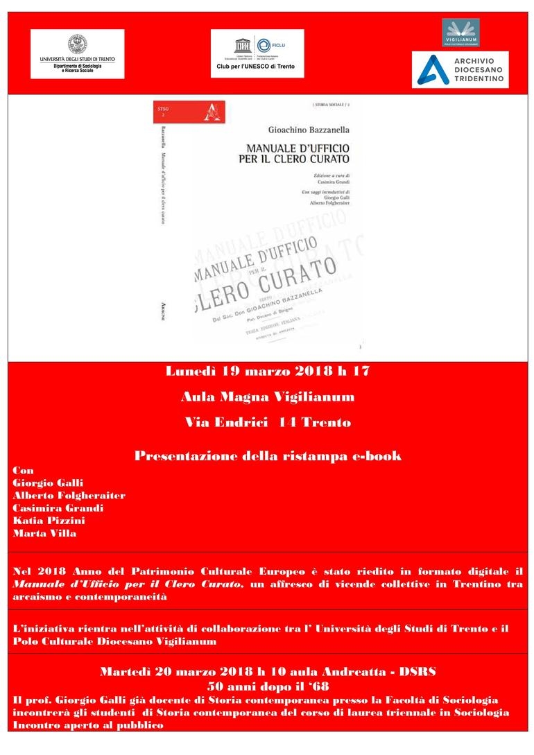 Galli assieme ad Alberto Folgheraiter, Casimira Grandi, Katia Pizzini e Marta Villa presenteranno la ristampa in ebook del “Manuale d'ufficio per il clero curato”, un volume di 1.108 pagine pubblicato la prima volta nel 1881, un affresco di vicende collettive in Trentino tra arcaismo e contemporaneità. «Il “Manuale”, compilato da don Gioachino Bazzanella, illustra(va) le leggi dello Stato Austriaco, le disposizioni dell’Ordinariato, i decreti e riporta(va) i formulari, utili per svolgere correttamente quelle funzioni di Ufficiali dello Stato civile che il Clero “austriaco” ebbe sino al 31 dicembre 1923. Vale a dire, la regolare tenuta dei registri dei nati, dei morti e dei matrimoni» ricorda Alberto Folgheraiter.