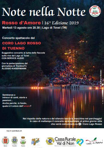 “Note nella notte” è una proposta culturale accolta ogni anno da un pubblico sempre più numeroso ma attento e rispettoso, uno spettacolo en plein air in uno fra i luoghi più magici del Trentino, caratterizzato da semplicità e autenticità: le voci umane, il fuoco delle fiaccole, l'unicità del Lago di Tovel, le Dolomiti di Brenta.