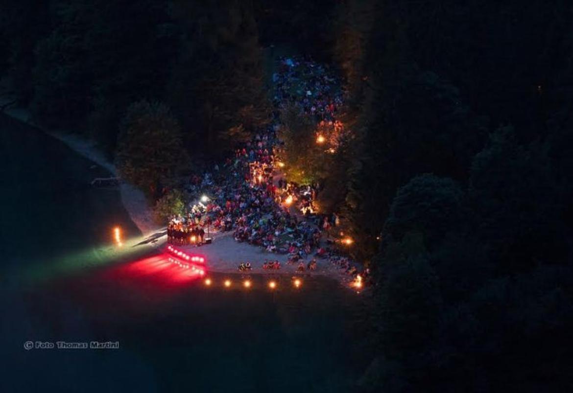 Un anfiteatro naturale che toglie il fiato, un'atmosfera fiabesca dove il pubblico si stringe attorno al Coro con grande rispetto, attenzione e spirito di adattamento (adagiandosi su coperte proprie o “seggiole naturali”), la luce mistica delle fiaccole che si riverbera sulla acque del Lago e, protagoniste su tutto, le voci e i canti di montagna legati dal filo conduttore dell’Amore.