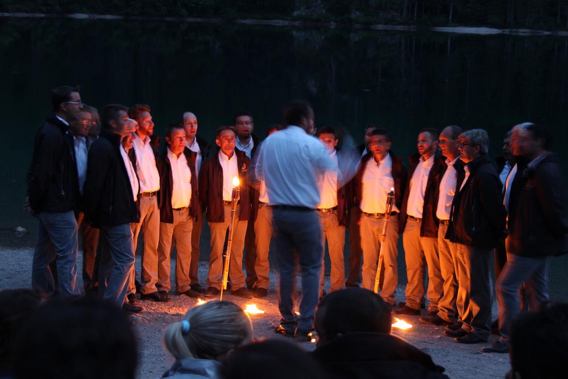 L'emozione del canto popolare di montagna viene amplificata dallo struggente scenario del lago all'imbrunire, trasformandosi in suggestione fiabesca quando la luce del giorno si spegne e rimangono solo le fiaccole a vibrare nell'oscurità con le voci del coristi.