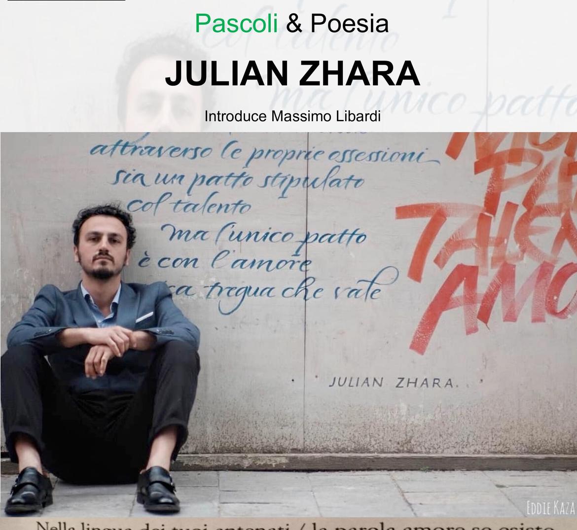 Julian Zhara, poeta, performer, organizzatore di eventi culturali, è nato a Durazzo (Albania) nel 1986. Si trasferisce in Italia nel 1999. Ha all’attivo due pubblicazioni, In apnea (Granviale, 2009) e Vera deve morire (pubblicata da Interlinea sulla collana Lyra giovani a cura di Franco Buffoni nel 2018). Presente tra i finalisti del Premio Dubito in L’epoca che scrivo, la rivolta che mordo (Agenzia X, 2013). Dal 2012 lavora col compositore Ilich Molin. Nel 2014 partecipa con un progetto di spoken music a Generation Y, evento sulla poesia ultima, a cura di Ivan Schiavone, al MAXXI. Sempre con lo stesso progetto, è presente all’omonimo documentario andato in onda su Rai 5. Cura assieme a Blare Out, il festival di poesia orale e musica digitale Andata e Ritorno.