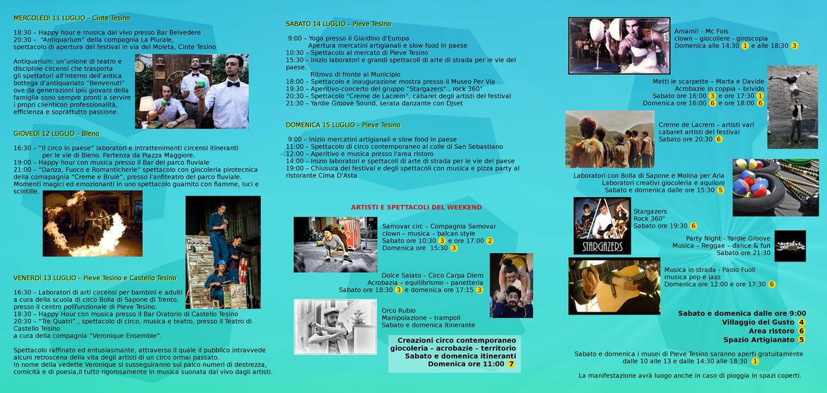 L'arte di strada sbarca nell'Altopiano del Tesino e Bieno! In omaggio agli antichi ambulanti tesini, esportatori d'arte in tutto il mondo, numerosi artisti si danno appuntamento ai piedi del Lagorai, per condividere col pubblico momenti di divertimento e autentico stupore. Mercatini, laboratori, concerti e oltre 10 grandi spettacoli: la magia del circo contemporaneo vi aspetta per conquistare grandi e bambini.