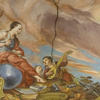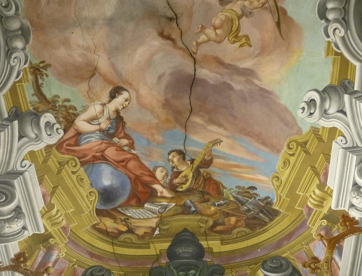 Il salone centrale del piano nobile, pensato per funzioni di rappresentanza e ancor oggi utilizzato per concerti di musica classica ed attività sociali, e per le prove del glorioso Coro della SOSAT – che nel palazzo ha anche la propria sede – venne affrescato dai pittori Carlo Spaventi e Francesco Marchetti con motivi che stupiscono l’osservatore per gli arditi sfondamenti prospettici e per la ricchezza di elementi simbolici tra cui mappamondi e sfere armillari, emblemi delle arti e della guerra e grandi stemmi nobiliari. Al centro della volta a botte è raffigurata una splendida Allegoria della Musica. Al Marchetti sono attribuite anche le 32 tele della contigua sala, dedicate agli Dei dell’Olimpo.