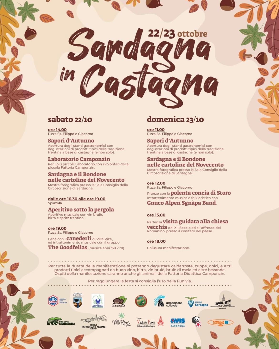 Si inizia sabato 22 alle 14:00 con stand gastronomici e prodotti tipici e si proseguirà fino a sera con laboratori per i più piccoli, la mostra fotografica dedicata al "Bondone nelle cartoline del Novecento" e per concludere con il concerto dei GOODFELLAS con musiche degli anni Sessanta e Settanta.Si riprende domenica 23 ottobre alle 11:00 con gli stand gastronomici e castagneAlle 12:00 polenta concia di Storo accompagnata con la GNUCO ALPEN SGNAPA BAND.Nel pomeriggio visita guidata alla Chiesa vecchia di Sardagna.