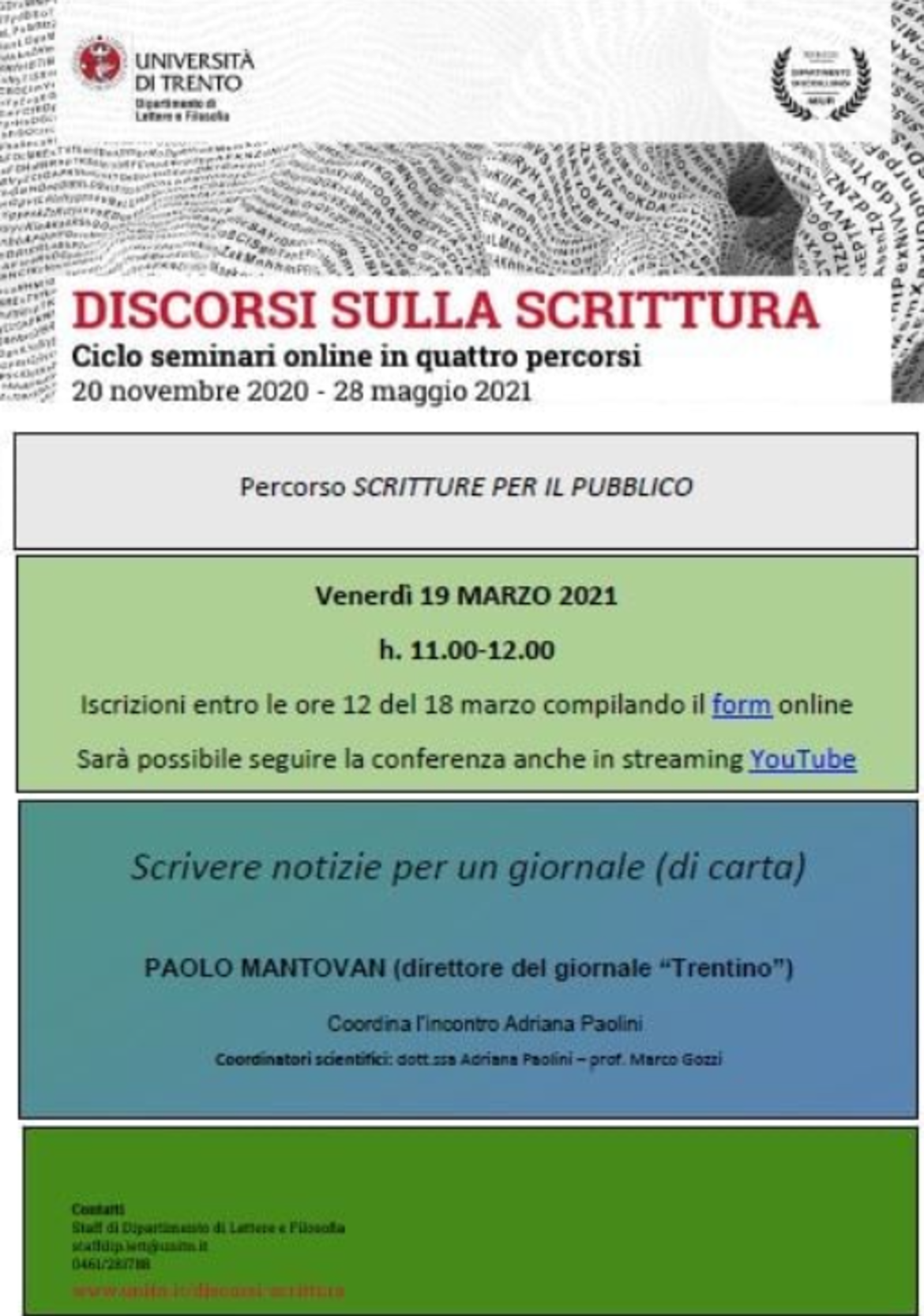 Sarà possibile seguire l'evento sul canale Youtube del Dipartimento di Lettere: