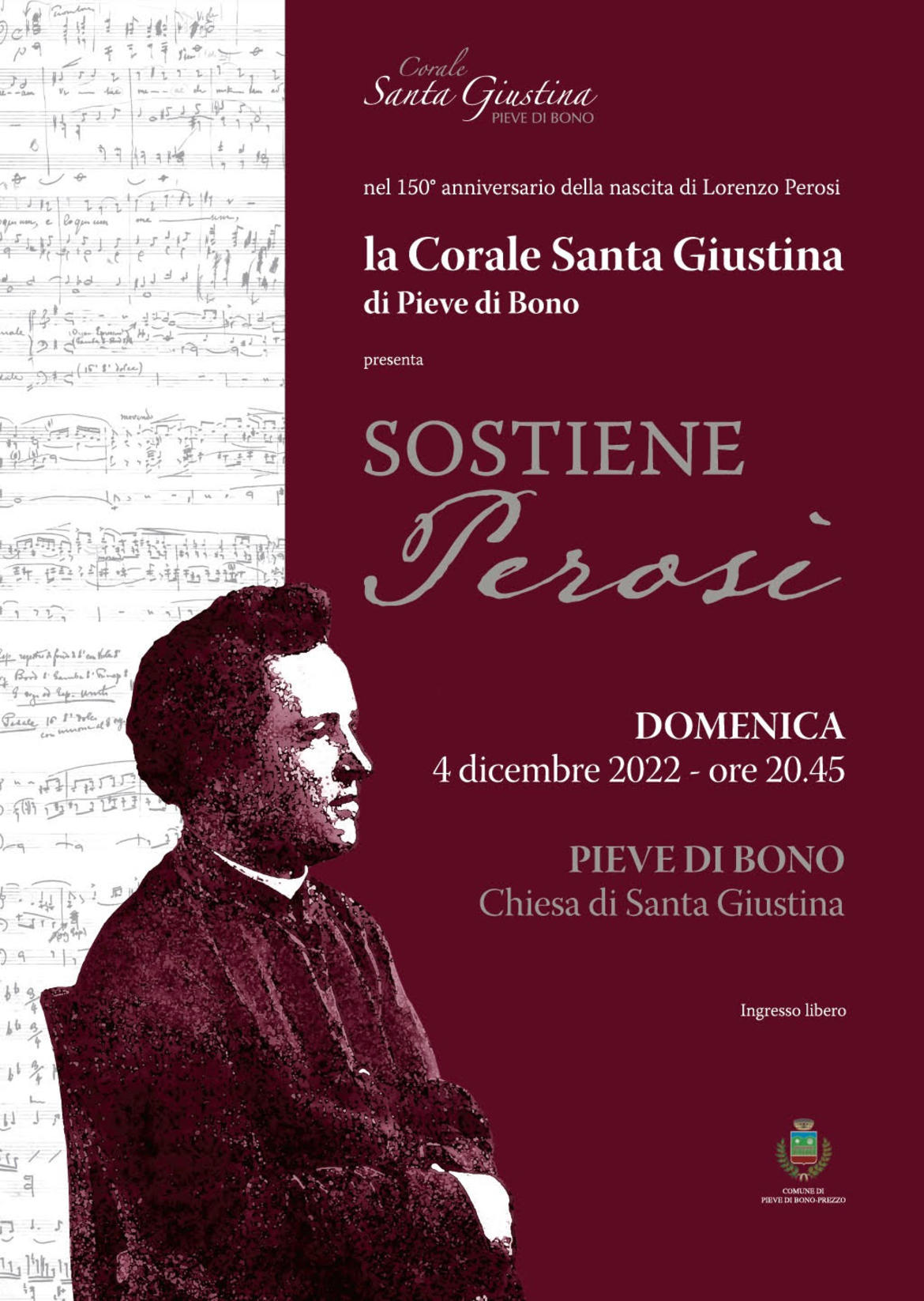 Il concerto del 4 dicembre è un omaggio a Monsignor Lorenzo Perosi (Tortona, 21 dicembre 1872 – Roma, 12 ottobre 1956) in occasione del 150° anniversario dalla nascita. Perosi è stato un presbitero, compositore e direttore di coro italiano. Autore di musica sacra, noto per i suoi oratori, le sue messe polifoniche e i suoi mottetti, fu un compositore molto prolifico.