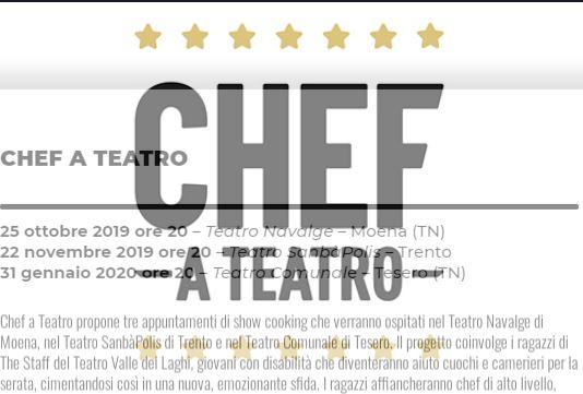 Chef a Teatro propone tre appuntamenti di show cooking che verranno ospitati nel Teatro Navalge di Moena, nel Teatro SanbàPolis di Trento e nel Teatro Comunale di Tesero.