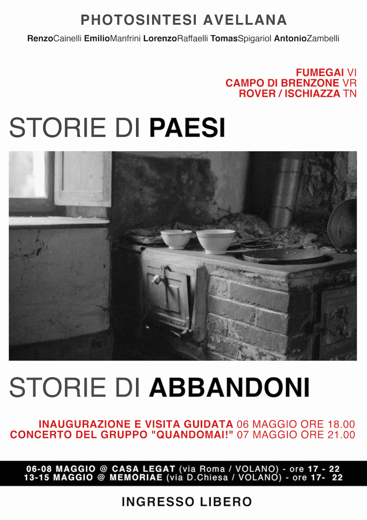 All’evento “Memoriae”, la manifestazione di metà maggio che a Volano celebra ogni anno le tradizioni religiose e storiche del paese, si aggiunge quest'anno la mostra fotografica “Storie di paesi, storie di abbandoni”, frutto di una ricerca portata avanti da un piccolo gruppo di appassionati fotoamatori che si è dato il nome di “Photosintesi Avellana”.