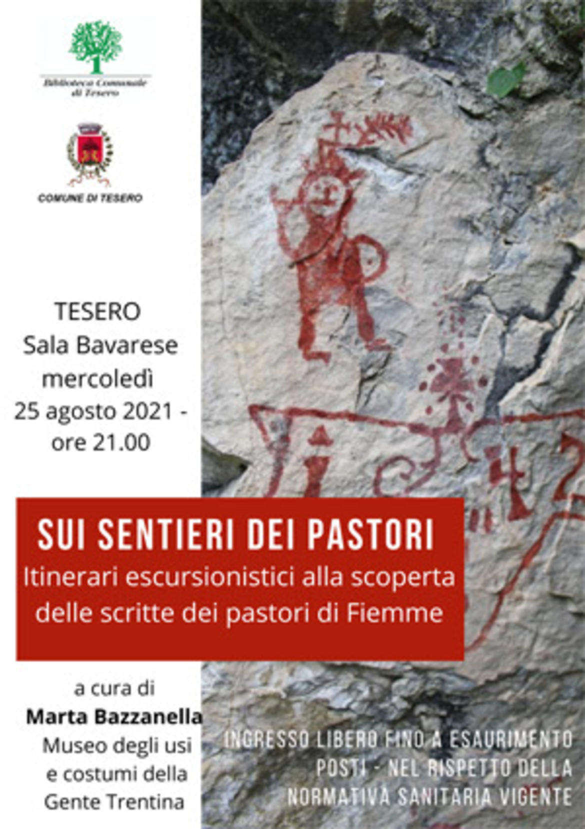 Marta Bazzanella, etnoarcheologa del Museo, presenta nella Sala Bavarese di Tesero la guida "Sui sentieri dei pastori. Itinerari escursionistici alla scoperta delle scritte dei pastori di Fiemme" (a cura di Marta Bazzanella, BQE edizioni, Trento, 2018).