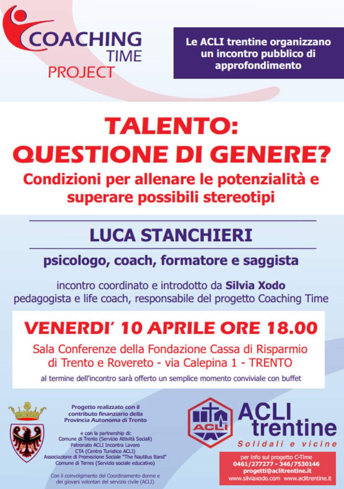 Le ACLI Trentine, con il finanziamento della Provincia Autonoma di Trento ed il patrocinio del Comune di Trento e di altri Enti Partner, nell'ambito del Progetto Coaching Time organizza una serata sul tema "TALENTO: QUESTIONE DI GENERE? Condizioni per allenare le potenzialità e superare possibili stereotipi".