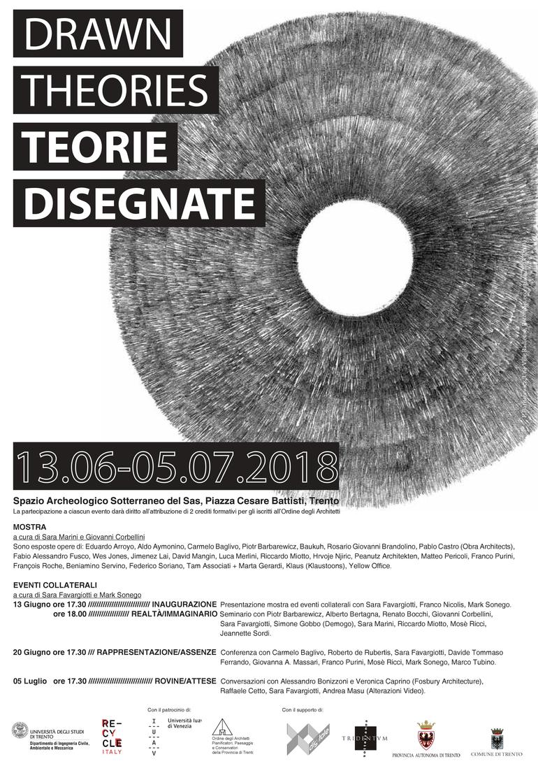 La mostra “Teorie Disegnate / Drawn Theories” raccoglie un paesaggio internazionale di autori che esprimono la propria posizione sul riciclo in architettura attraverso il disegno. Il progetto è organizzato nell’ambito della ricerca nazionale Re-cycle Italy. Nuovi cicli di vita per architetture e infrastrutture della città e del paesaggio e intende affrontare il potenziale di elaborazione concettuale legato al disegno, alla sua capacità di osservare la realtà e cogliere visioni progettuali latenti. Agli autori invitati, la cui ricerca sviluppa il disegno come una forma di scrittura, è stato chiesto di partecipare alla riflessione in corso sui nuovi cicli che interessano la continua produzione dell’esistente, il grande archivio della storia, le occasioni e i tradimenti della loro manipolazione. Drawn Theories / Teorie disegnate insiste quindi anche sul problema della grafia, del segno e del ruolo dell’autore in architettura. Sono esposte opere di Eduardo Arroyo, Aldo Aymonino, Carmelo Baglivo, Piotr Barbarewicz, Baukuh, Rosario Giovanni Brancolino, Pablo Castro (Obra Architects), Fabio Alessandro Fusco, Wes Jones, Jimenez Lai, David Mangin, Luca Merlini, Riccardo Miotto, Hrvoje Njiric, Peanutz Architekten, Matteo Pericoli, Franco Purini, François Roche, Beniamino Servino, Federico Soriano, Tam Associati + Marta Gerardi, Klaus (Klaustoon), Yellow Office.