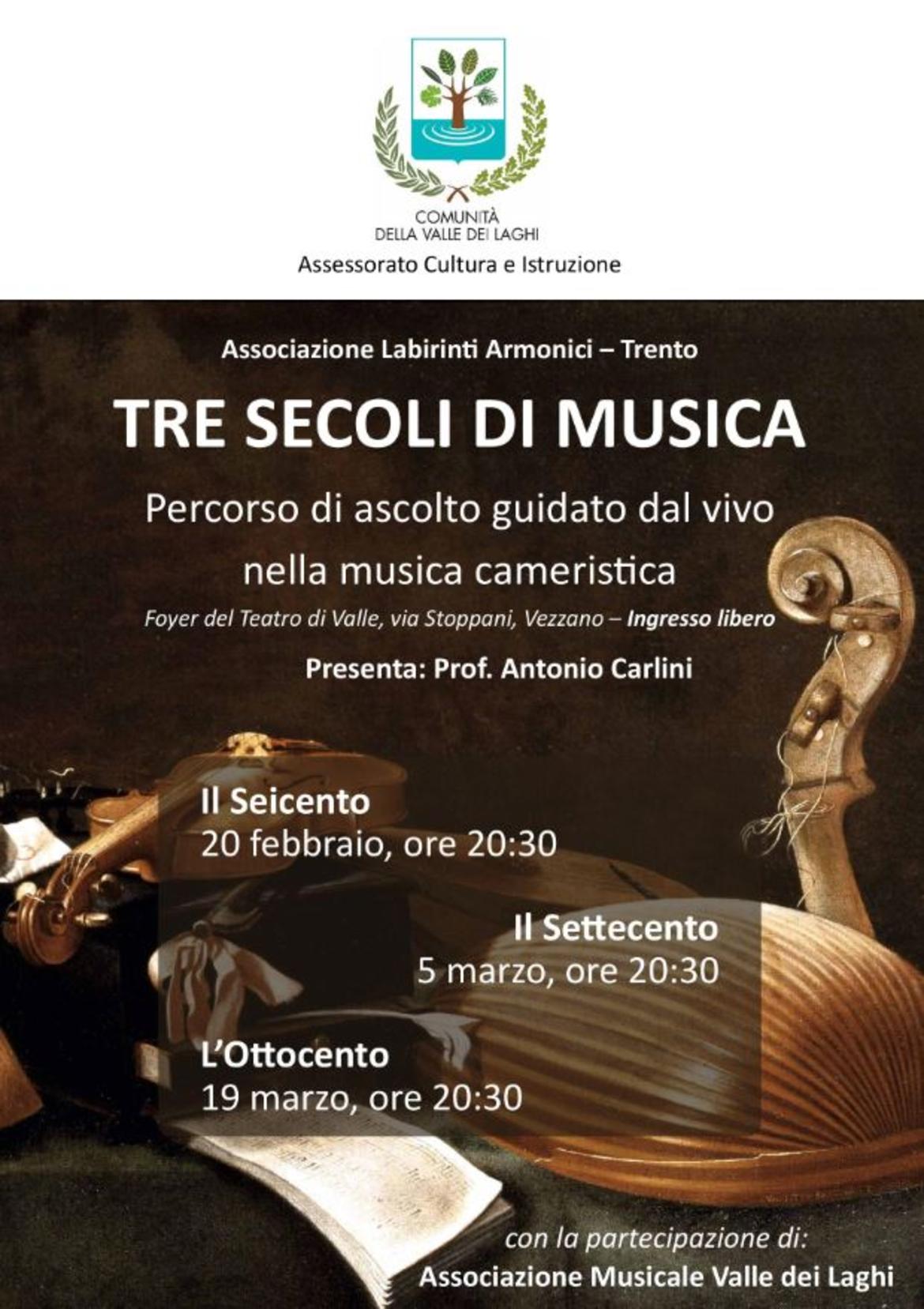 La Comunità della Valle dei Laghi ha recentemente emanato un bando con l’obiettivo di stimolare e sostenere la produzione culturale sul territorio; ora l’Assessorato alla Cultura e Istruzione prosegue la sua attività di promozione della crescita culturale proponendo un percorso di avvicinamento guidato alla musica classica intitolato “Tre secoli di musica”.