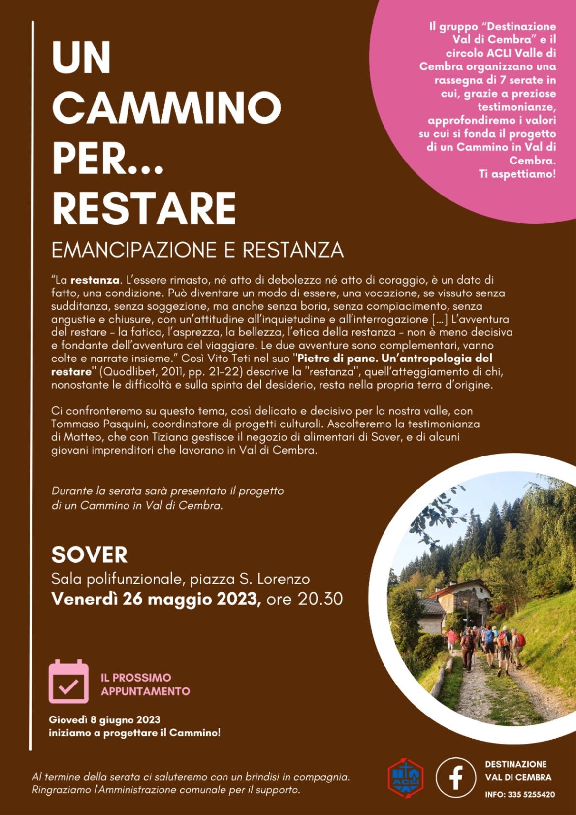 Venerdì 26 maggio, alle ore 20.30 presso la sala polifunzionale di Sover, in piazza San Lorenzo, ci confronteremo sul tema "emancipazione e restanza", grazie all'intervento di Tommaso Pasquini, coordinatore di progetti culturali, e di alcuni giovani imprenditori che lavorano in Val di Cembra e che hanno deciso di investire il proprio futuro sulla comunità di origine.