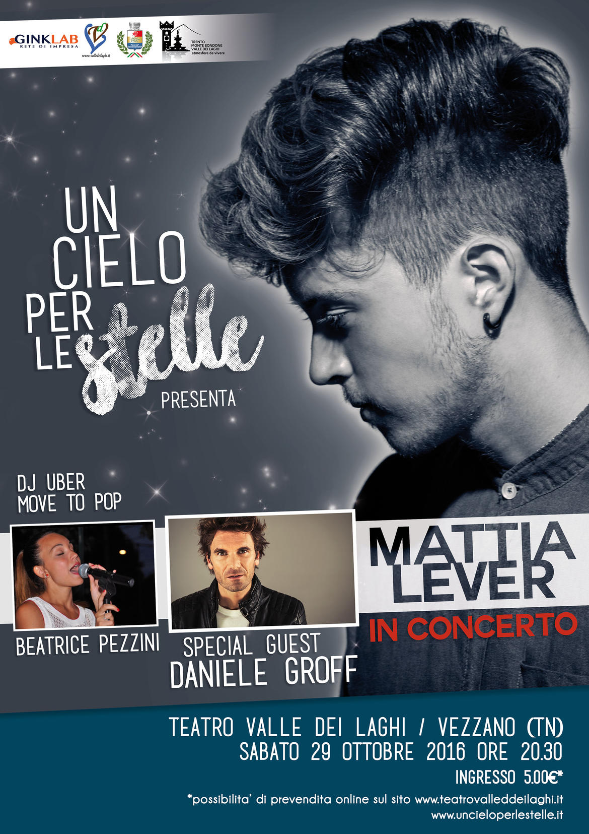 Sul palco anche i Move to Pop, la band che accompagna Mattia Lever nei suoi live, e Dj Uber Special Guest della serata Daniele Groff. Durante lo show saranno presentati alcuni dei maggiori successi che abbracceranno i più svariati gusti musicali in ambito pop, dai pezzi pietre miliari del pop italiano alle più recenti hit del panorama musicale internazionale. Sempre nella stessa serata Mattia Lever presenterà il suo nuovo inedito. Lo spettacolo sarà completato e valorizzato da una diffusione audio e show luci di primissimo livello.