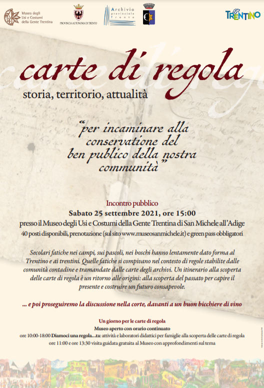Il Museo degli Usi e Costumi della Gente Trentina di San Michele all’Adige organizza un’intera giornata dedicata alle carte di regola, con attività e laboratori didattici per famiglie, visite guidate al Museo con approfondimenti sugli antichi statuti regolieri trentini.