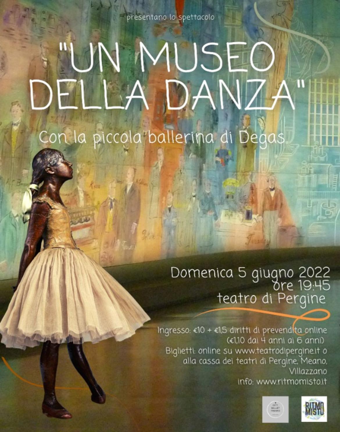 UN MUSEO DELLA DANZA. Con la piccola ballerina di Degas: Spettacolo degli allievi di danza classica e avviamento alla danza di Ritmomisto e City Ballet Trento. Attraverso gli occhi della famosa “Piccola danzatrice di quattordici anni” (modello in cera realizzato dal pittore Edgar Degas) una visita guidata in un fantasioso “museo della danza” che propone sulla sua galleria-palco omaggi ai più grandi balletti del repertorio classico. Coreografie di Lucrezia Gabrieli, Domenico Paglione, Nina Ejdziukiewicz, Alessandra Torregiani.