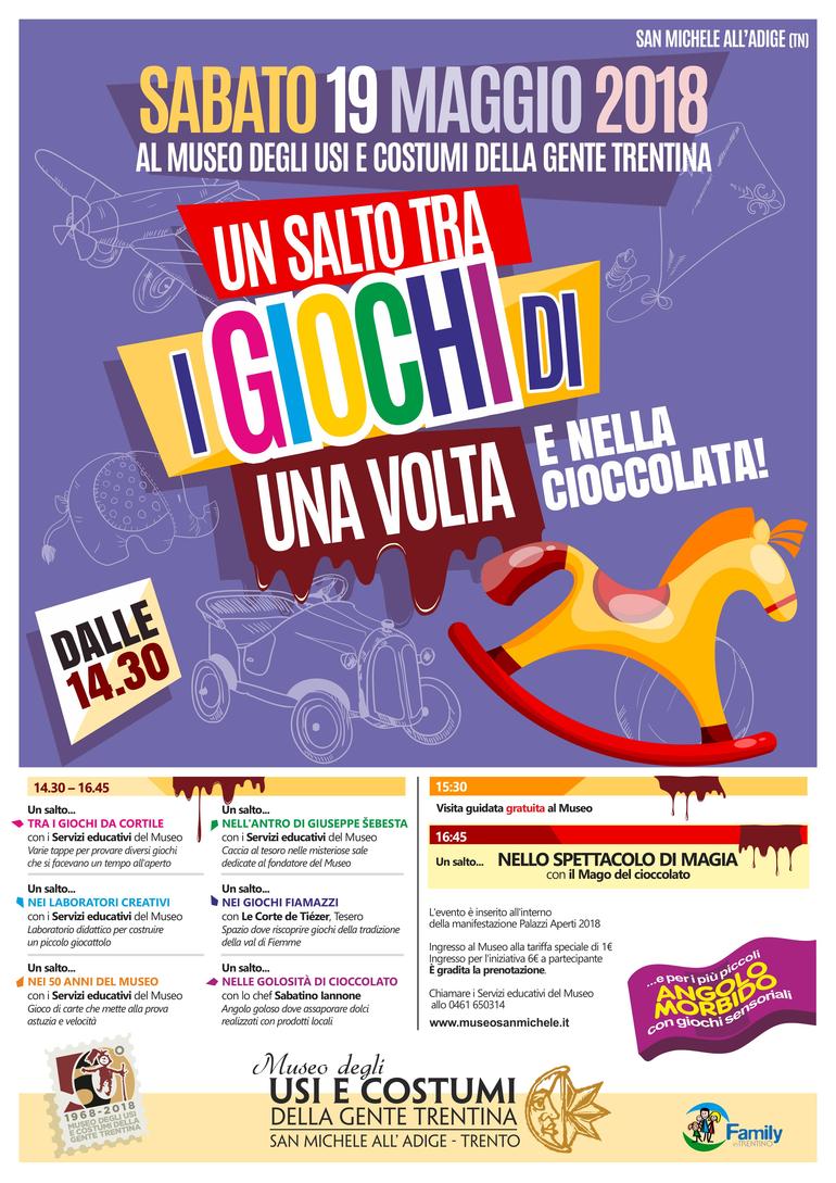 Il programma prevede numerosi giochi in cui cimentarsi, come i trampoli, il tiro al bersaglio, la gara dei tappi, il flipper, il tiro ai “cioni”… Ma anche laboratori per costruire giocattoli con materiali poveri, golosità al cioccolato da assaggiare con lo chef del ristorante “La contea” di Bolbeno, Sabatino Iannone, la possibilità di conoscere i giochi tradizionali della val di Fiemme con Le Corte de Tiézer, di scoprire un gioco ideato per i 50 anni del Museo e di conoscere meglio il fondatore del Museo attraverso una simpatica caccia al tesoro.